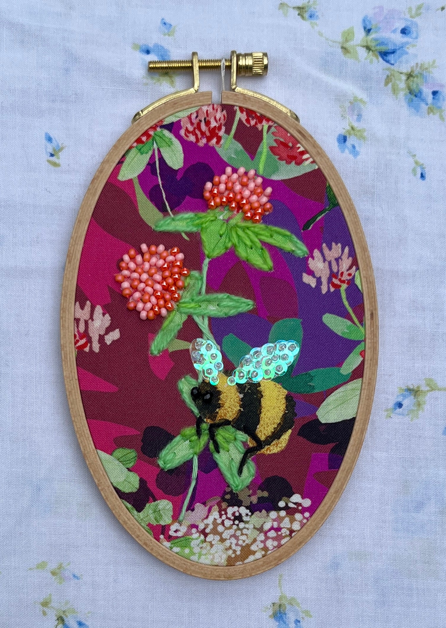 A beaded and embroidered hoop depicting a bee flying among the clover. Approx. 8"x5"