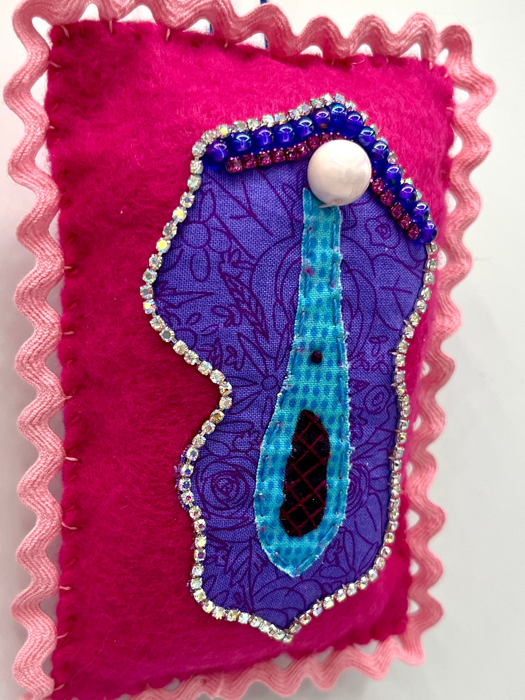 A wall-hanging glitzy vulva, adorned with rhinestones, beads, trim and embroidery.