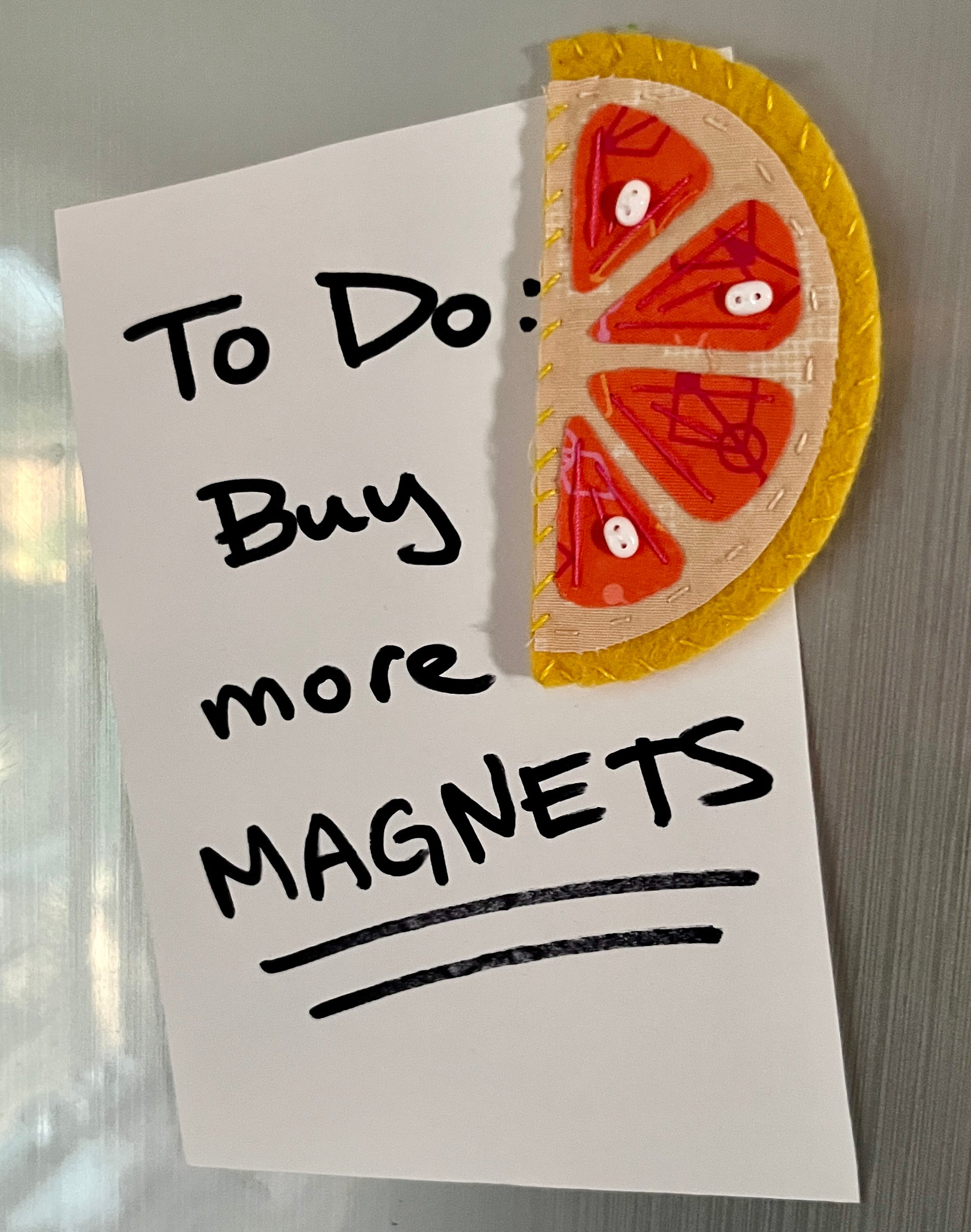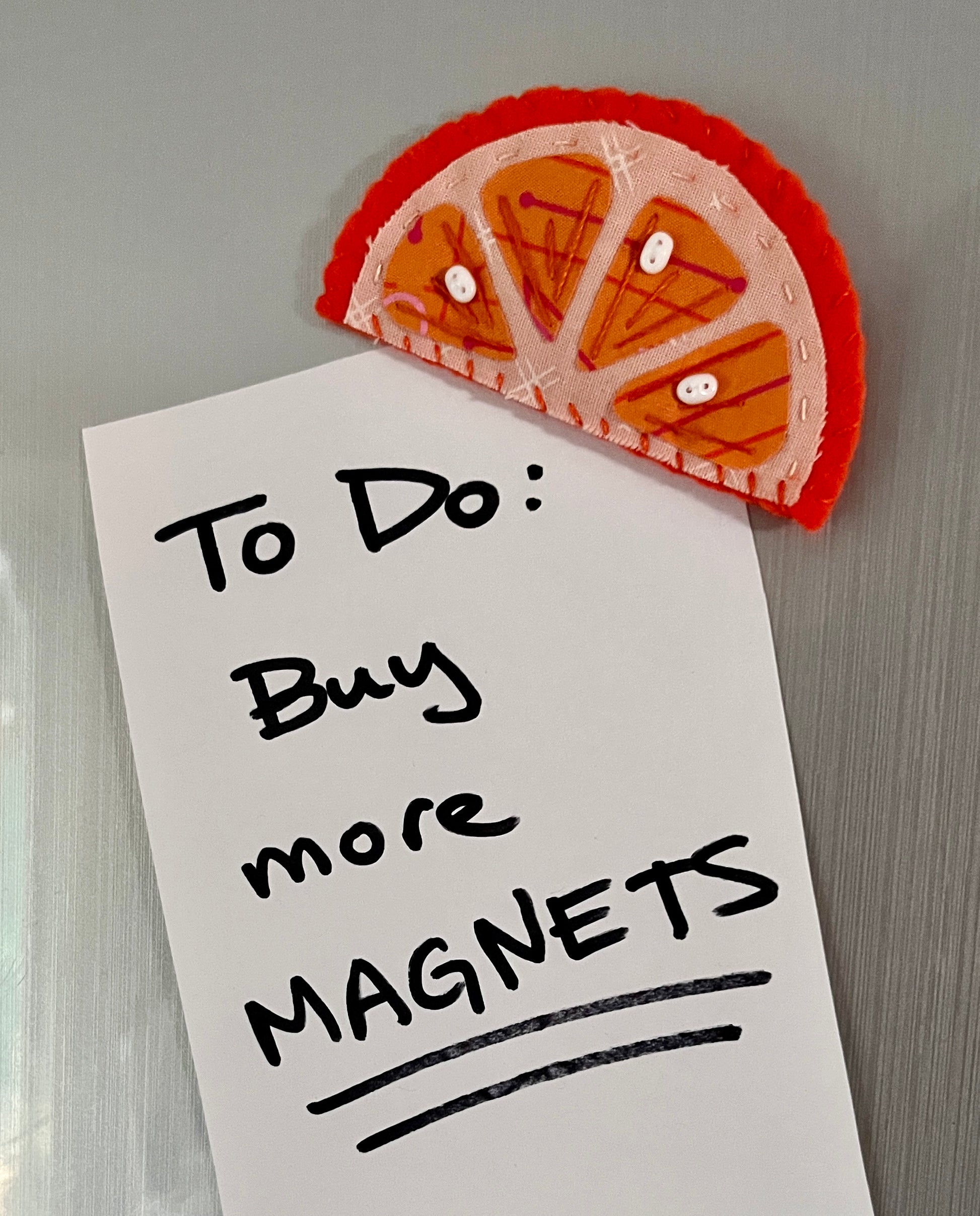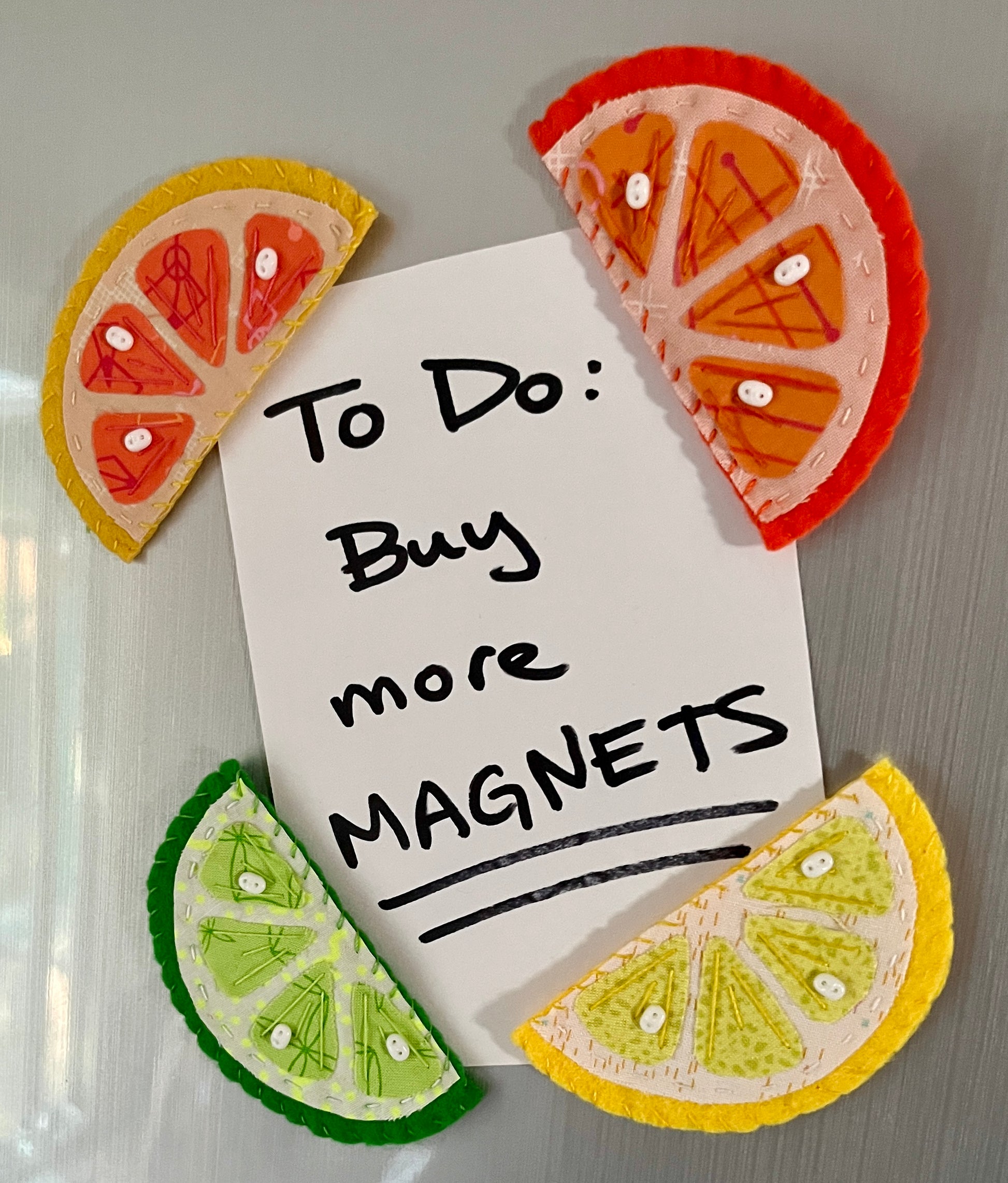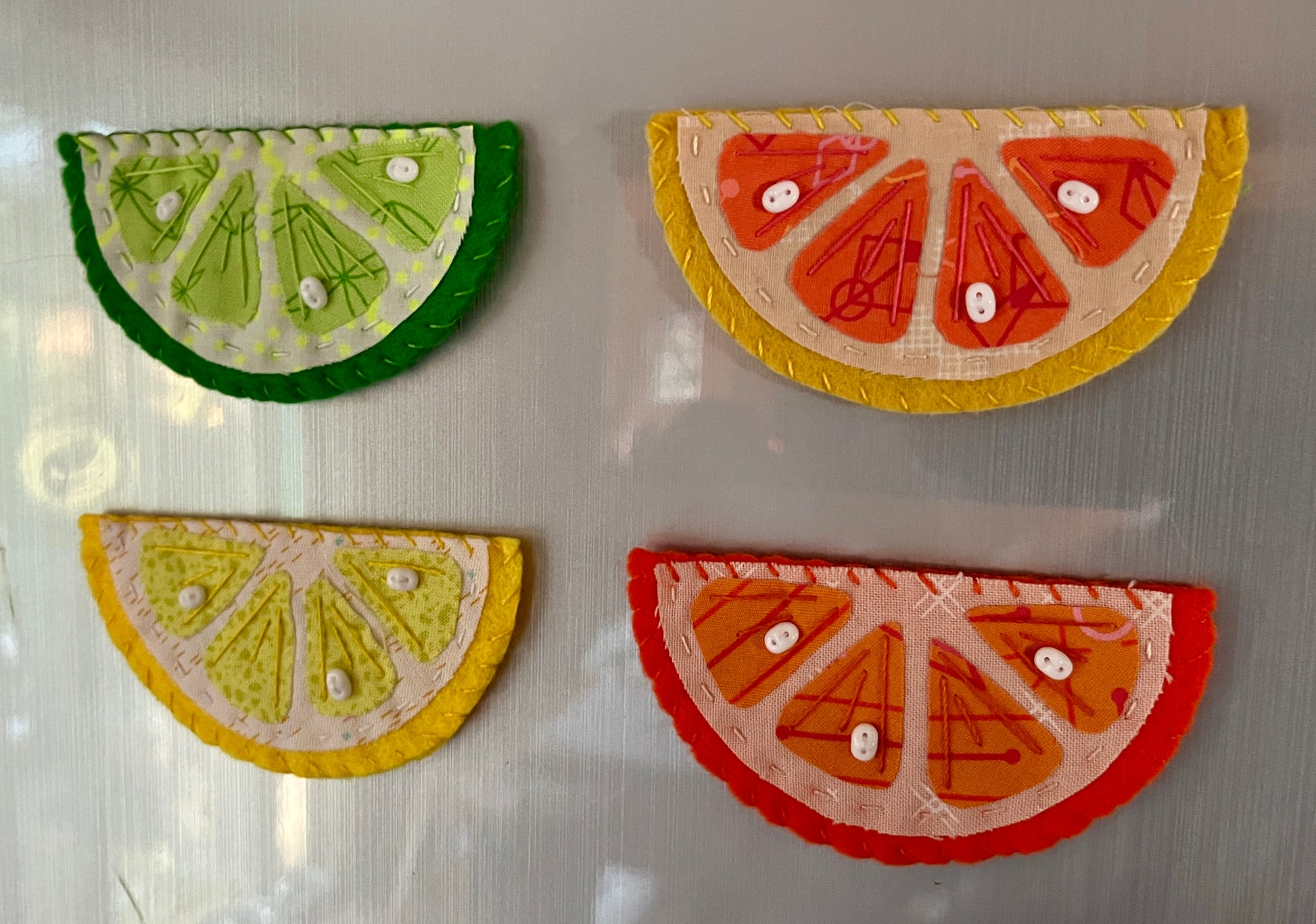 Hand-stitched and beaded refrigerator magnets that look like citrus wedges!