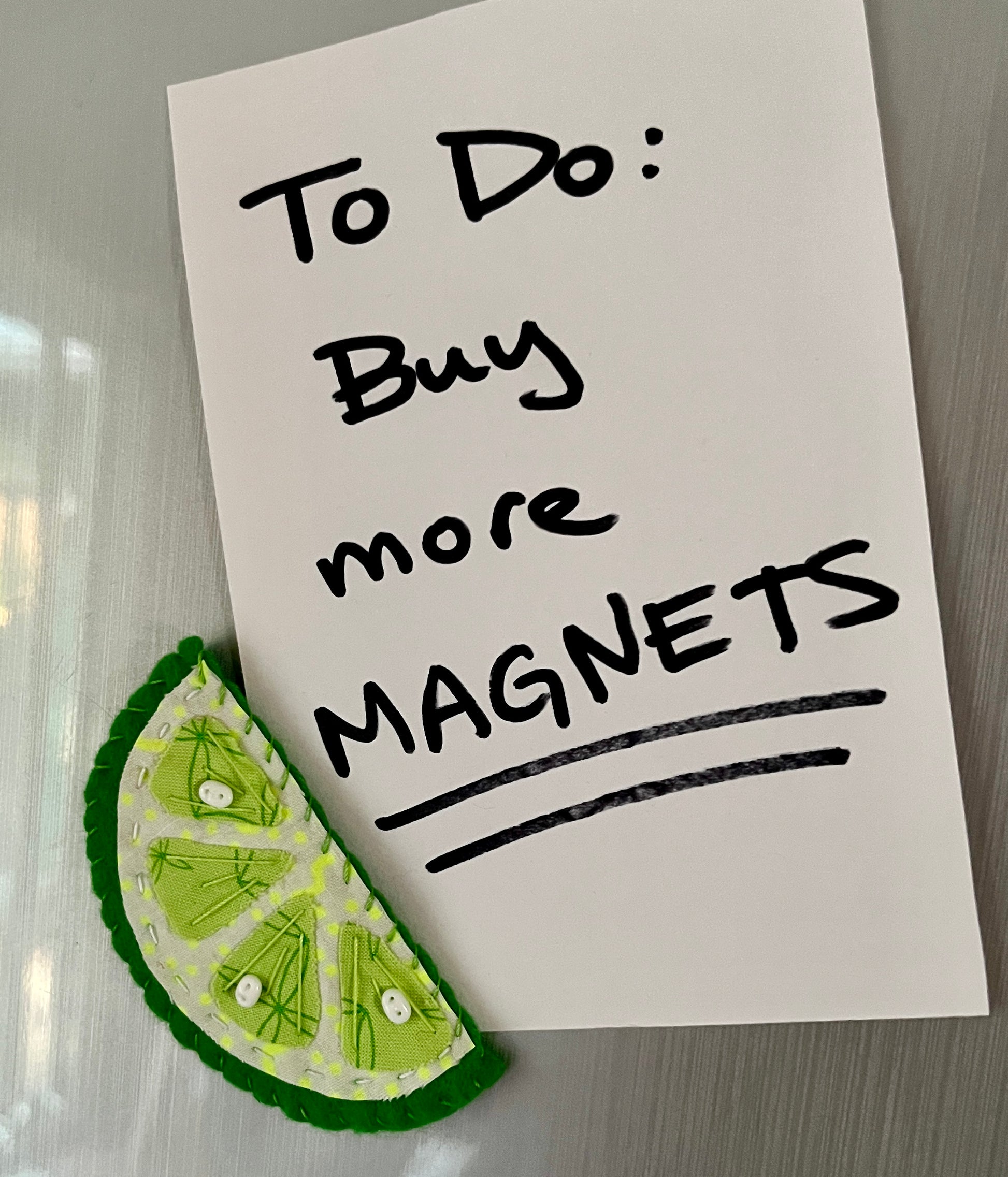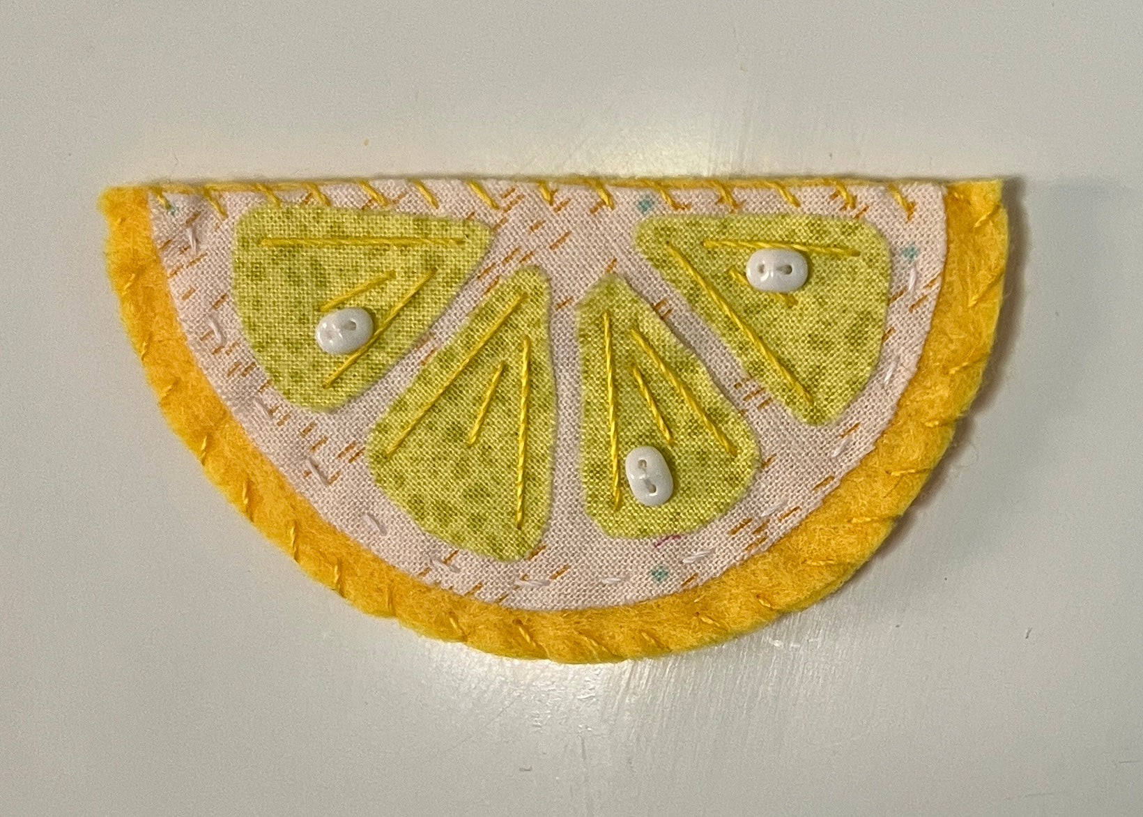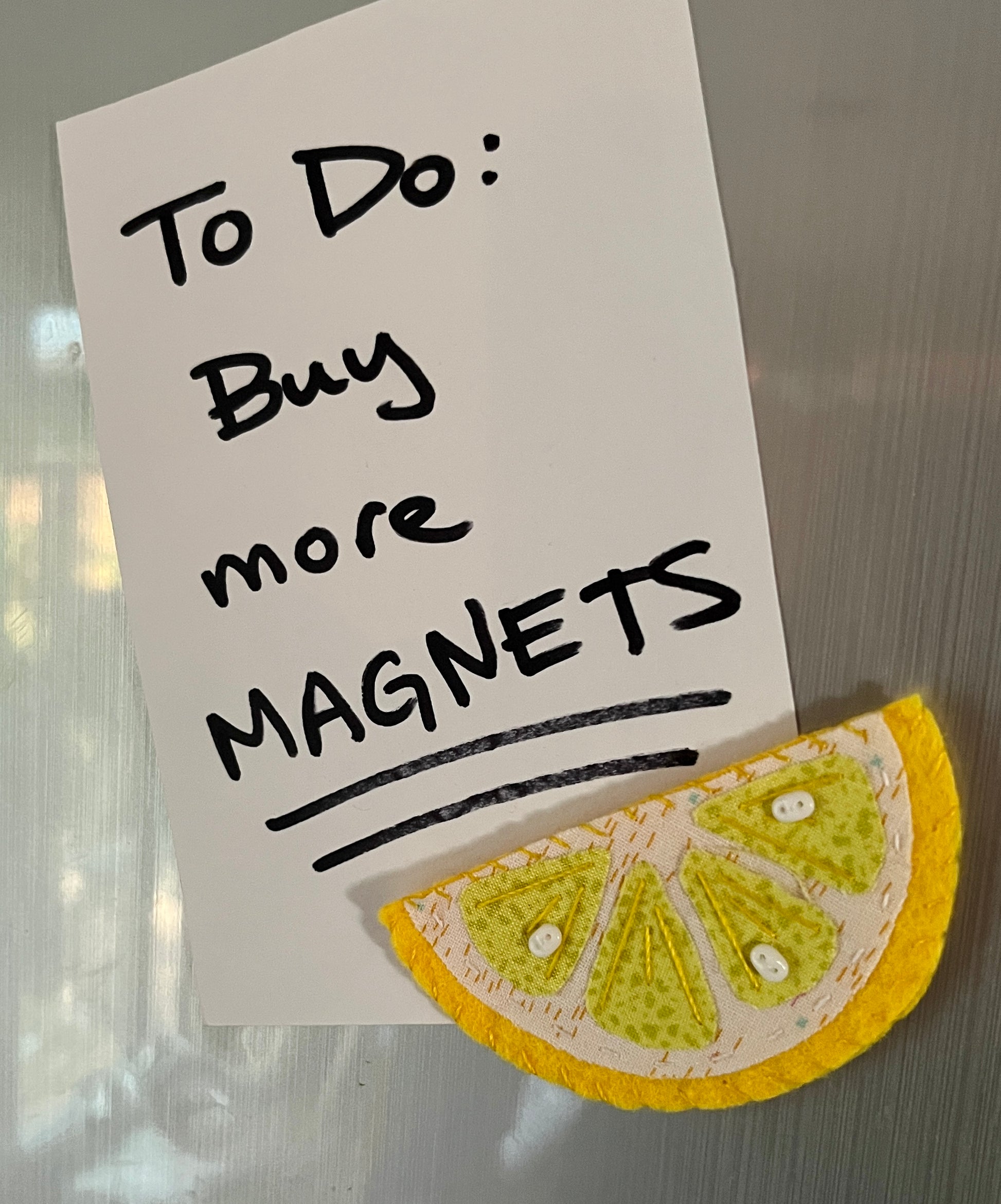 Hand-stitched and beaded refrigerator magnets that look like citrus wedges!