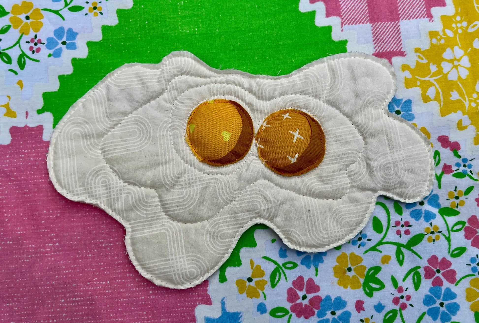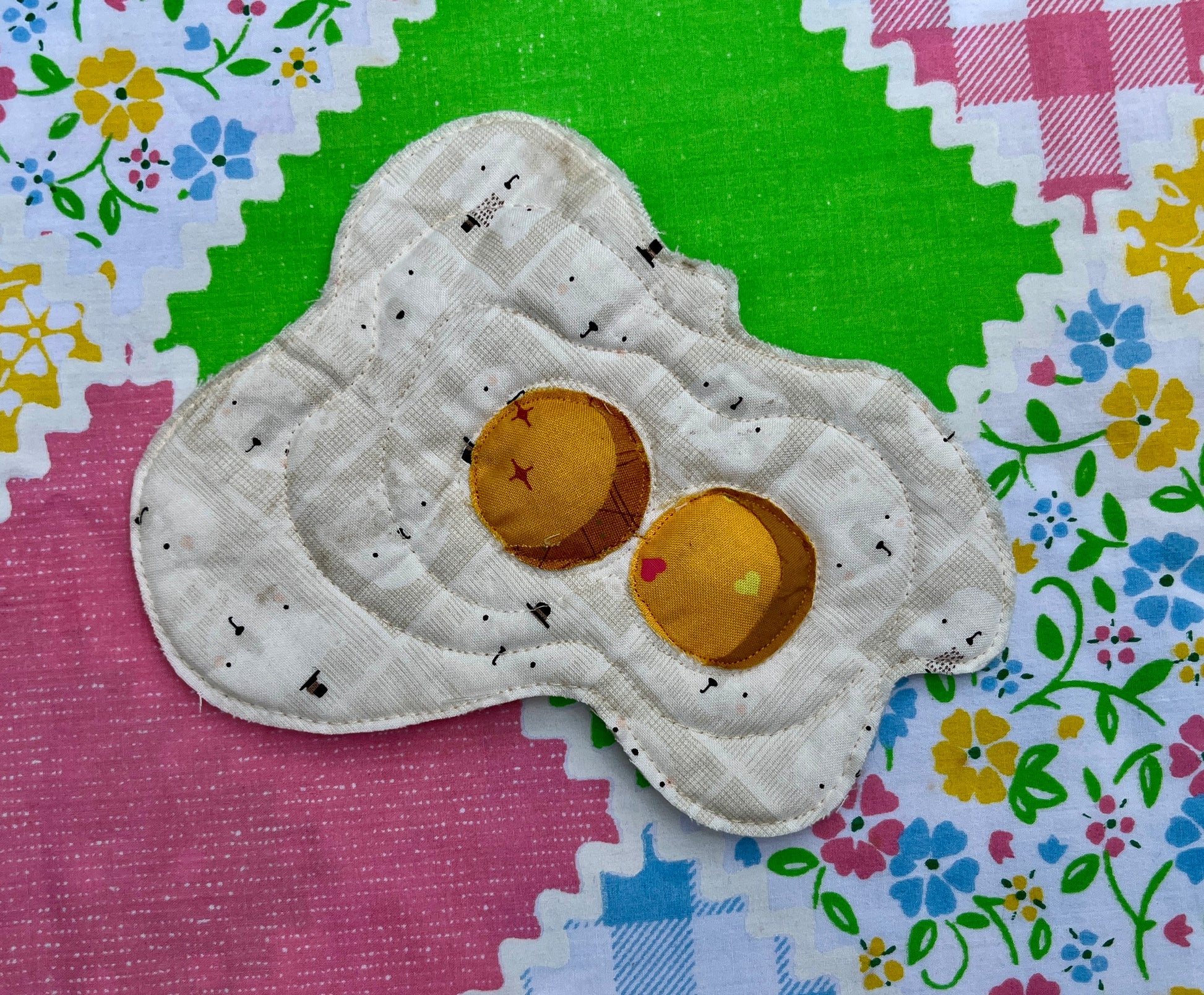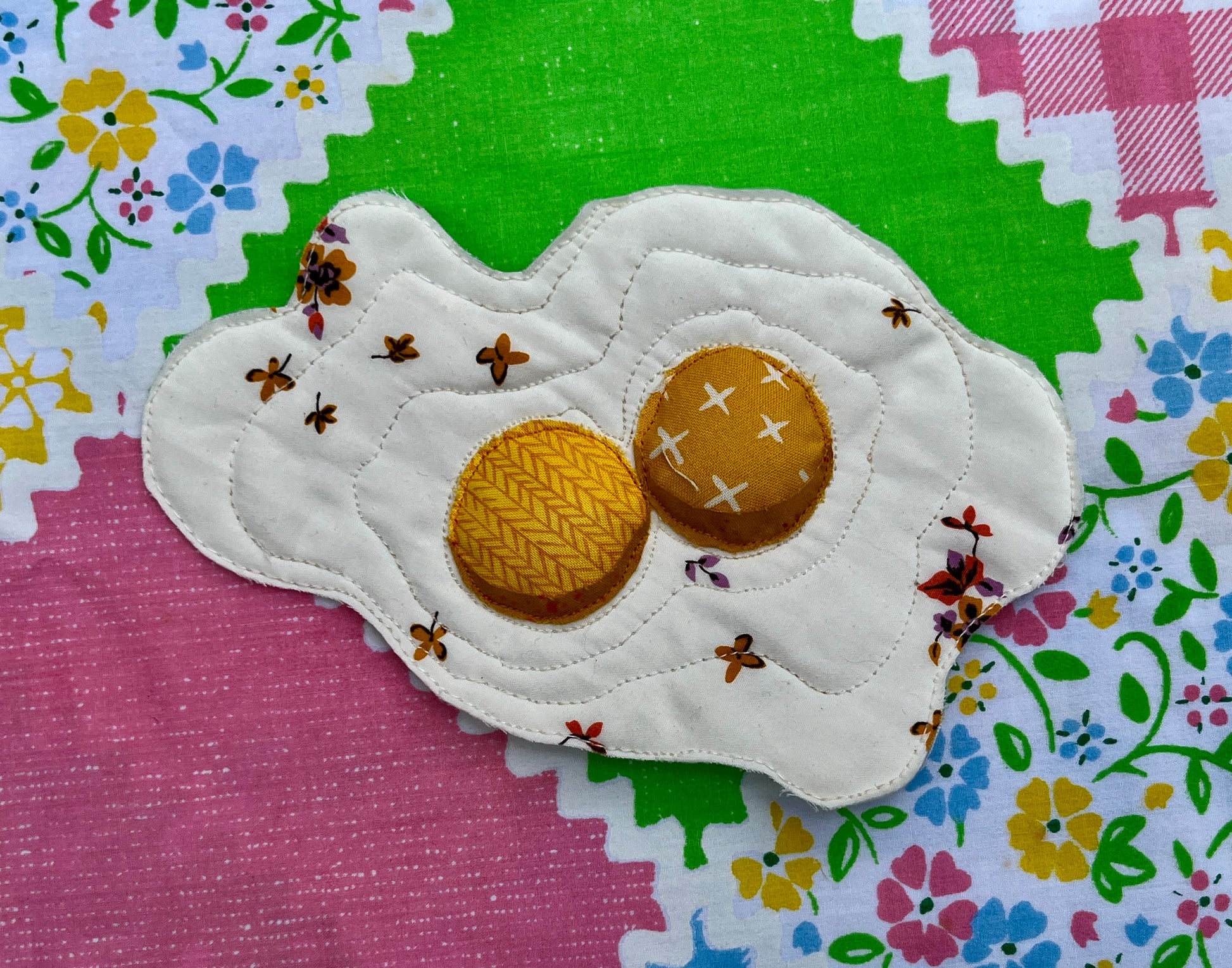A machine-quilted raw-edge applique double yolked egg with a hanging loop attached to the back. Scotchgarded for kitchen display! FOR DECORATION ONLY. NOT A POTHOLDER.