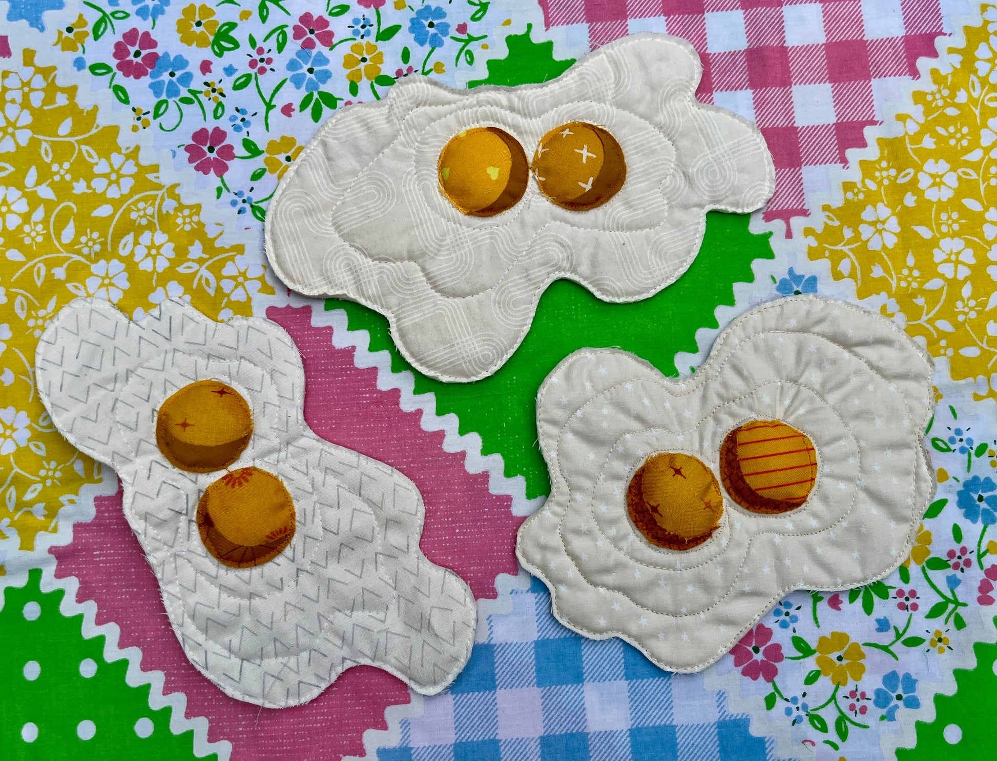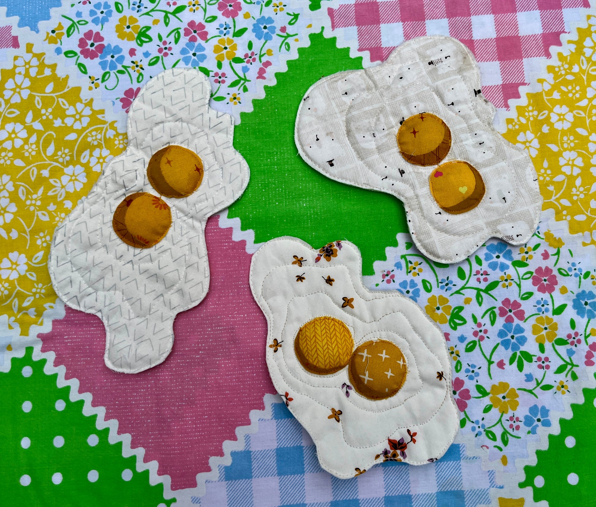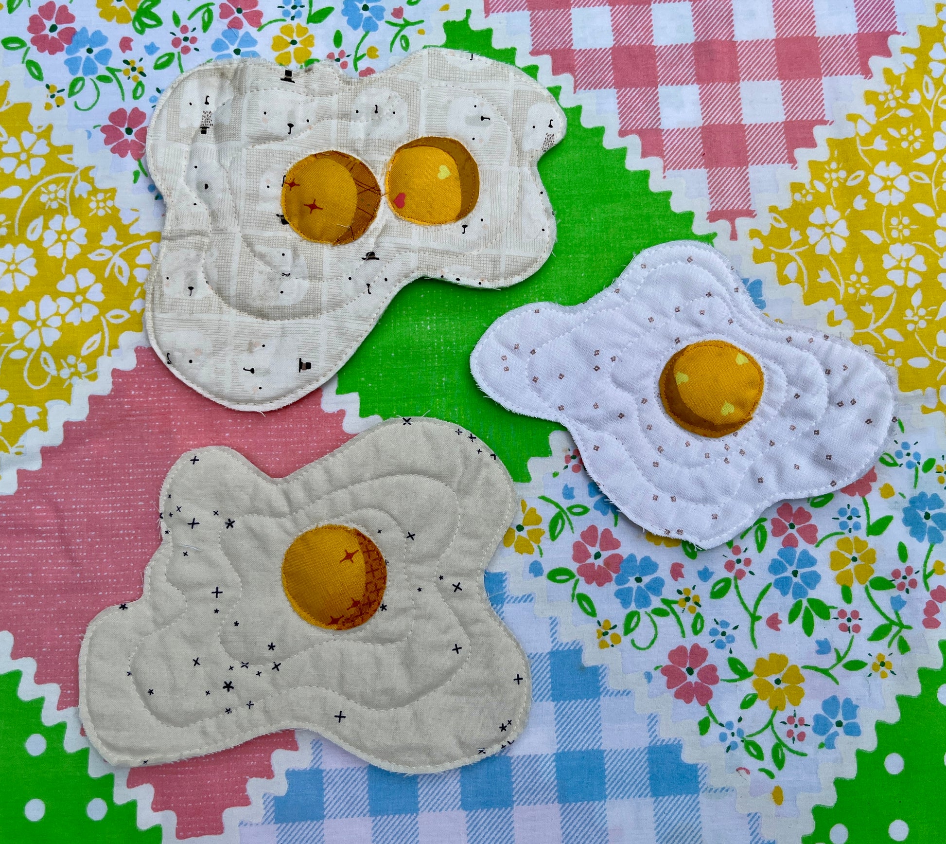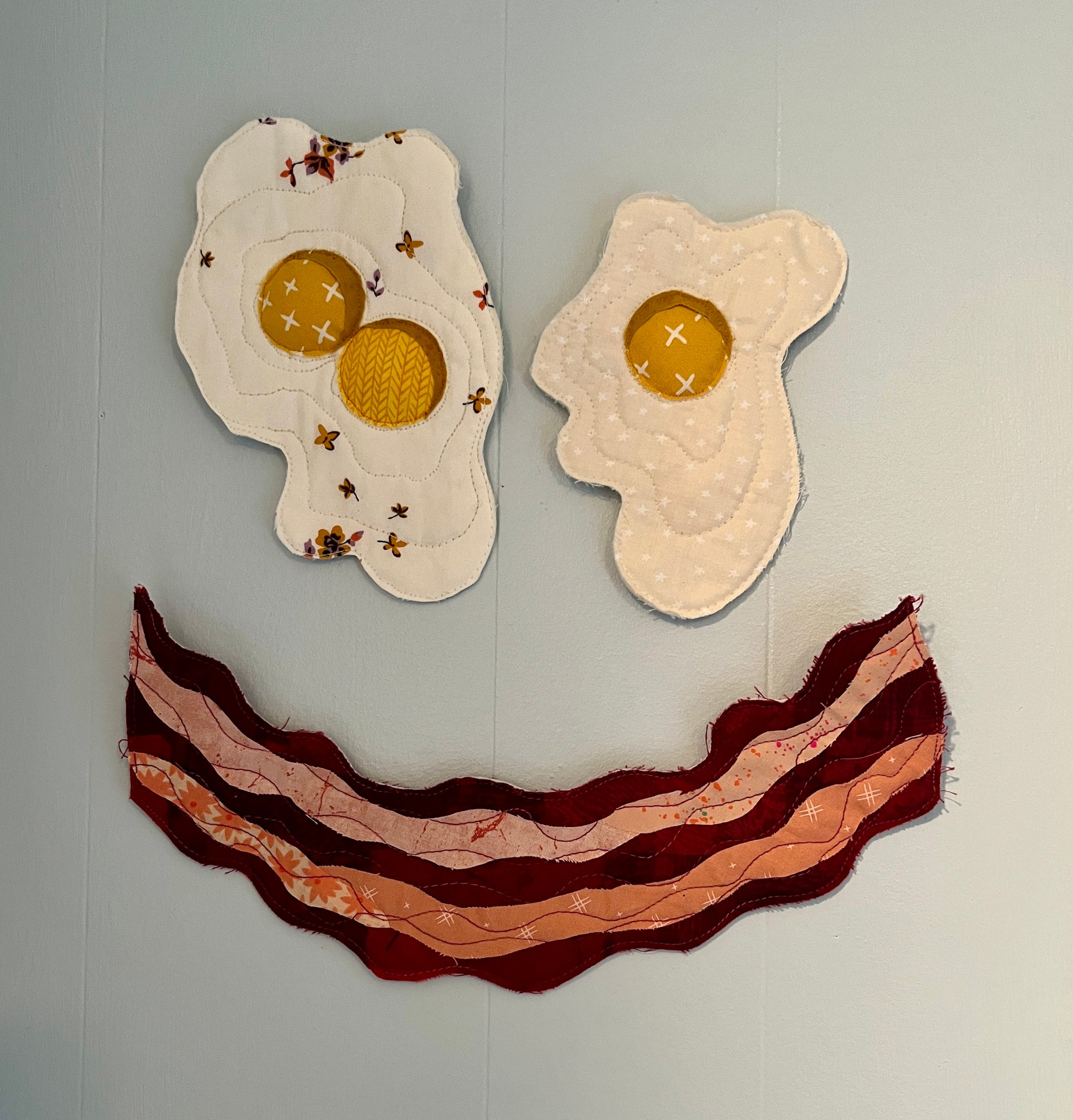 A machine-quilted raw-edge applique double yolked egg with a hanging loop attached to the back. Scotchgarded for kitchen display! FOR DECORATION ONLY. NOT A POTHOLDER.