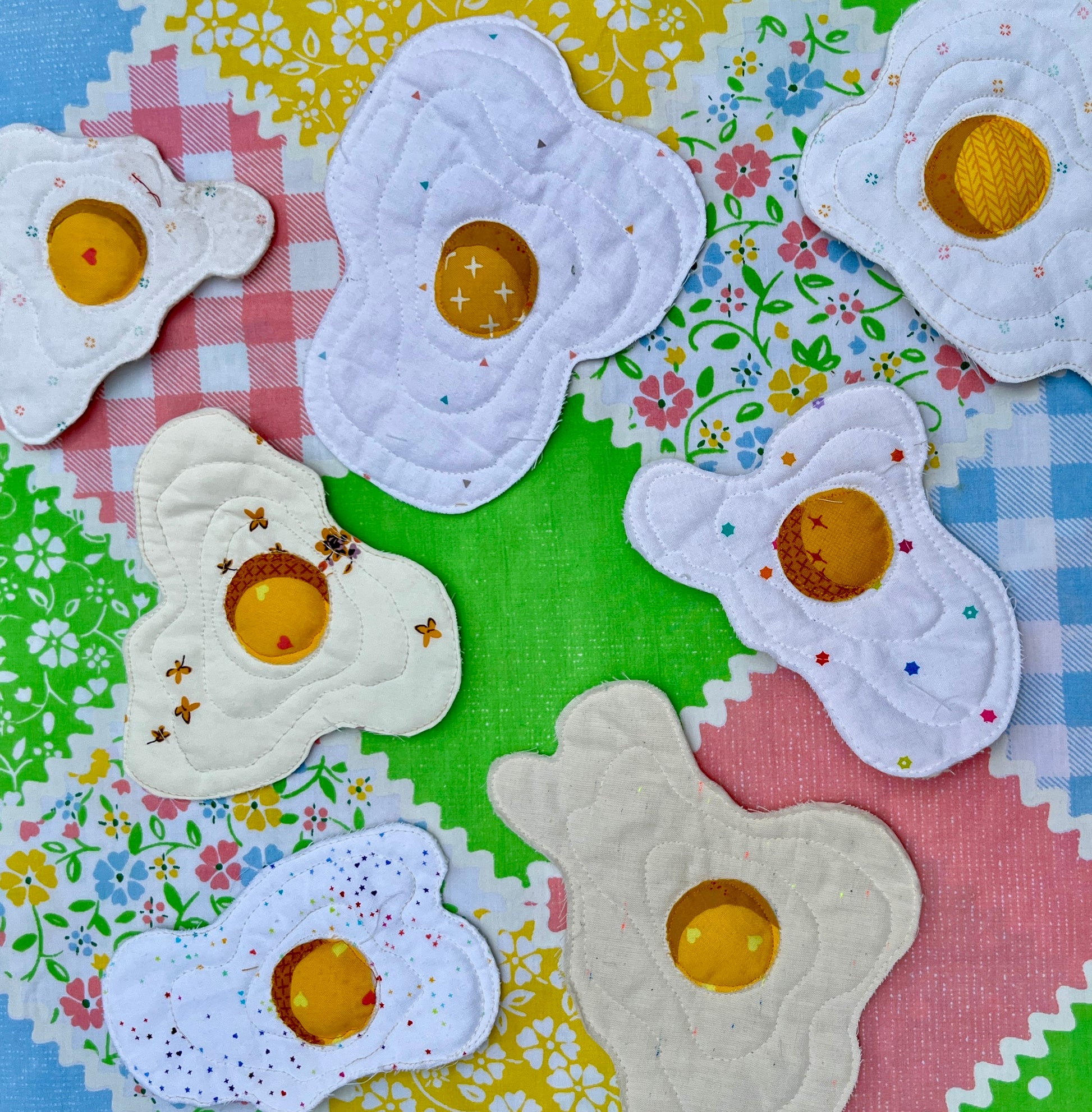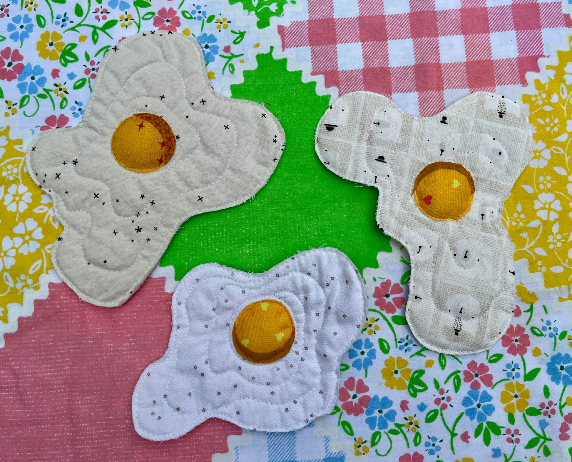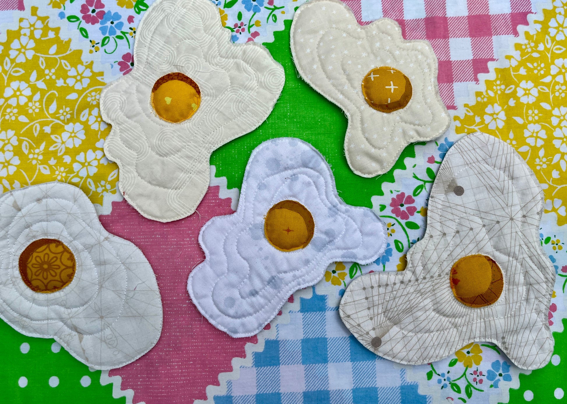 A machine-quilted raw-edge applique egg with a hanging loop attached to the back. Scotchgarded for kitchen display! FOR DECORATION ONLY. NOT A POTHOLDER.
