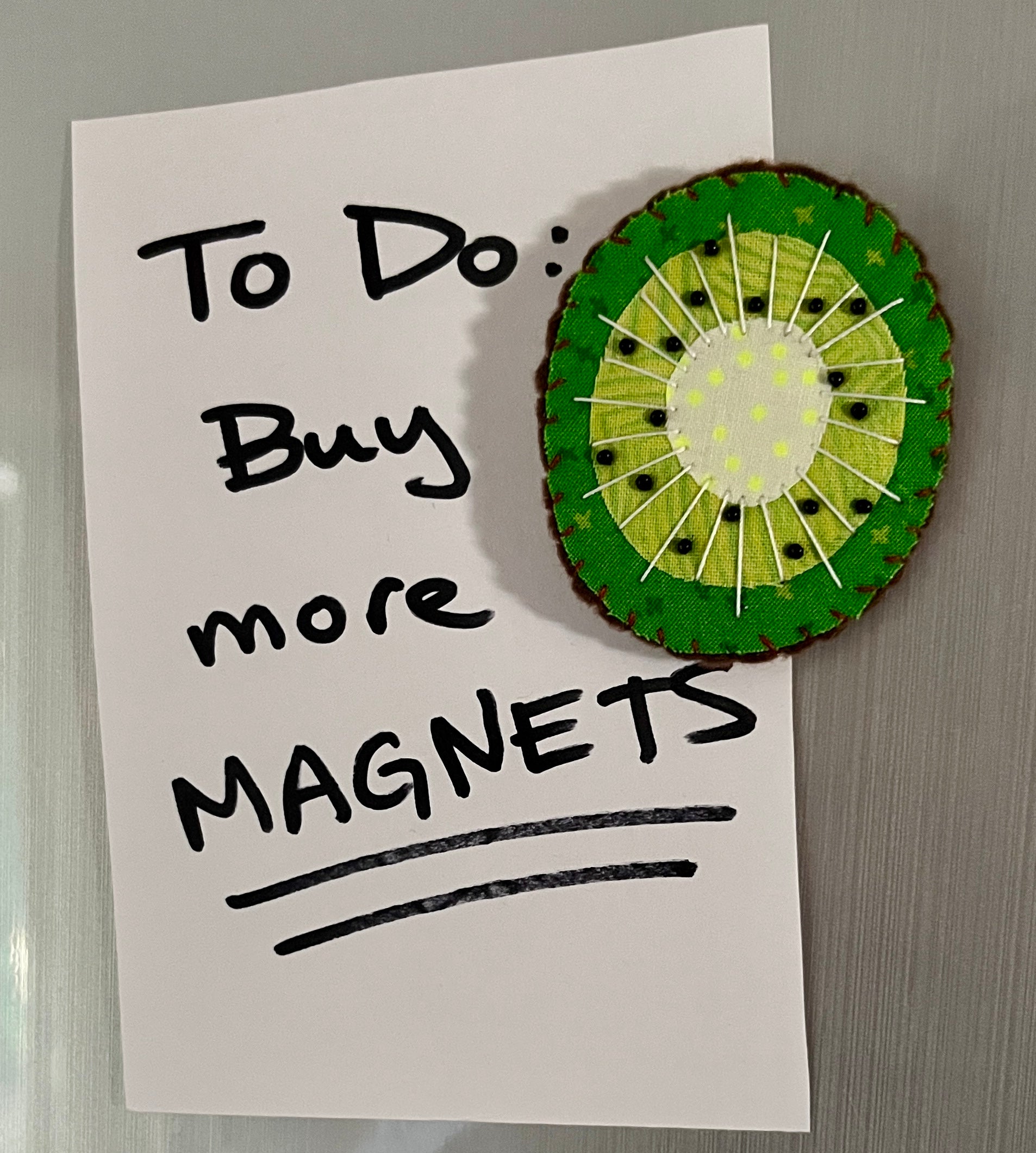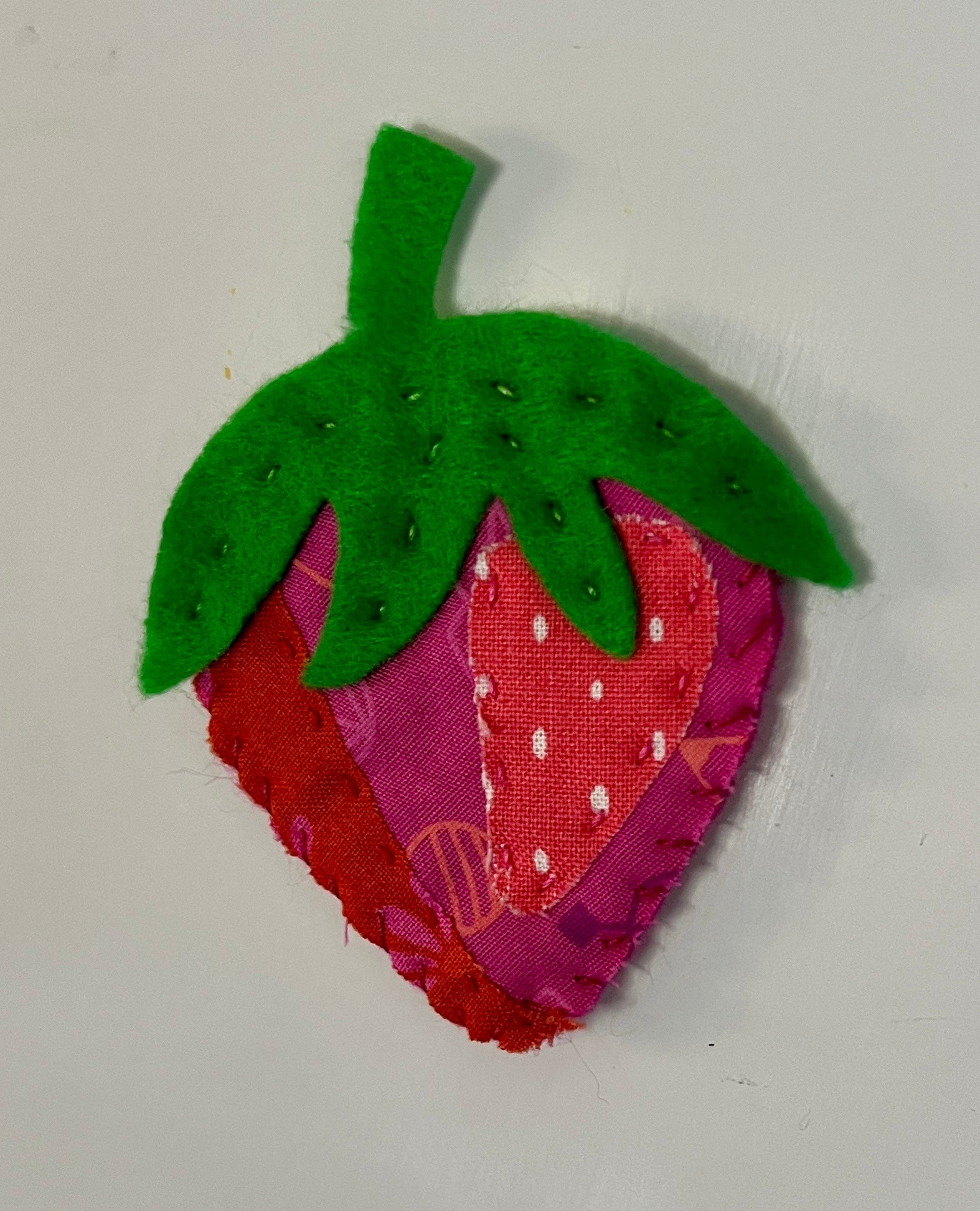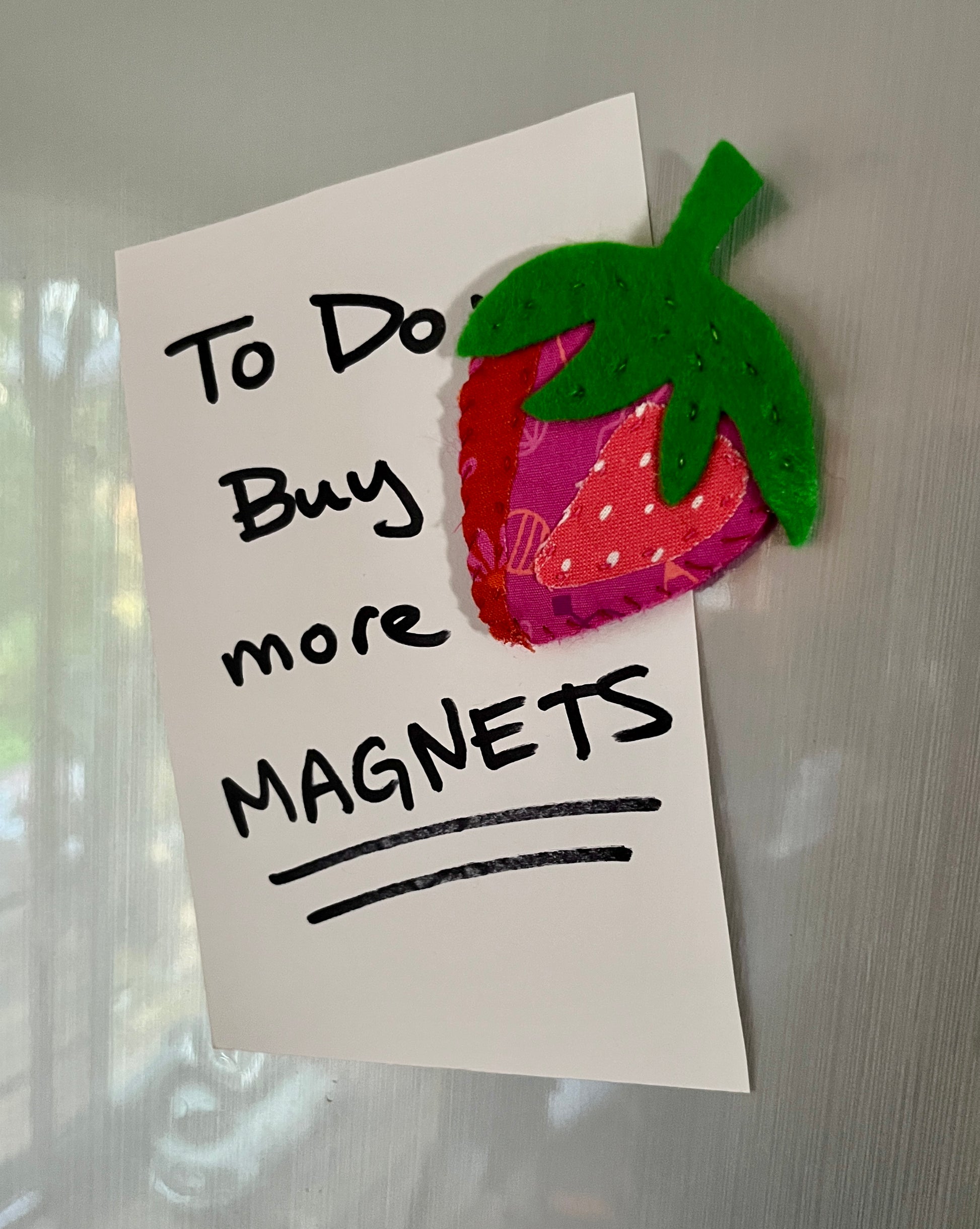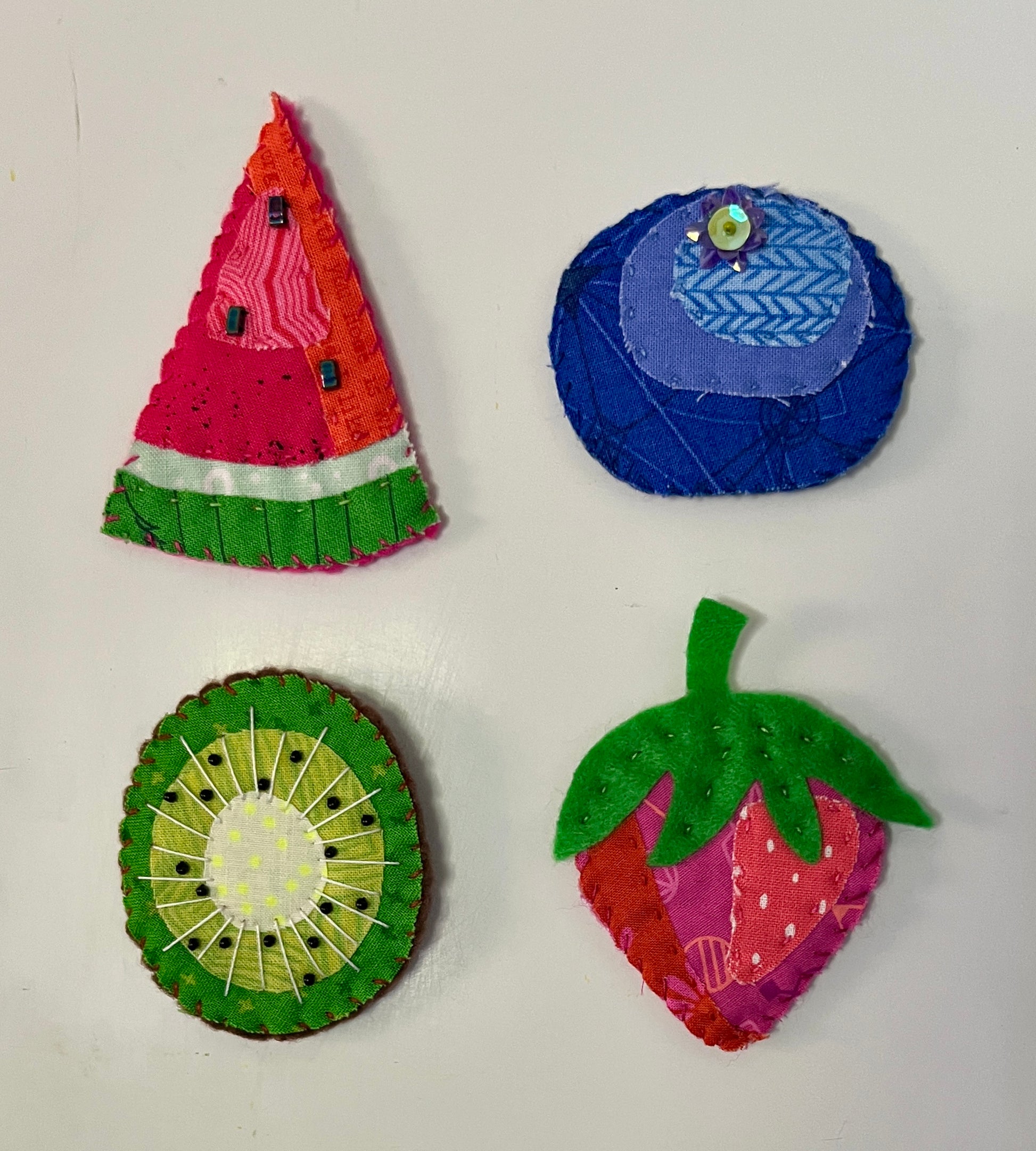 Hand-stitched and beaded refrigerator magnets that look like various fruits!
