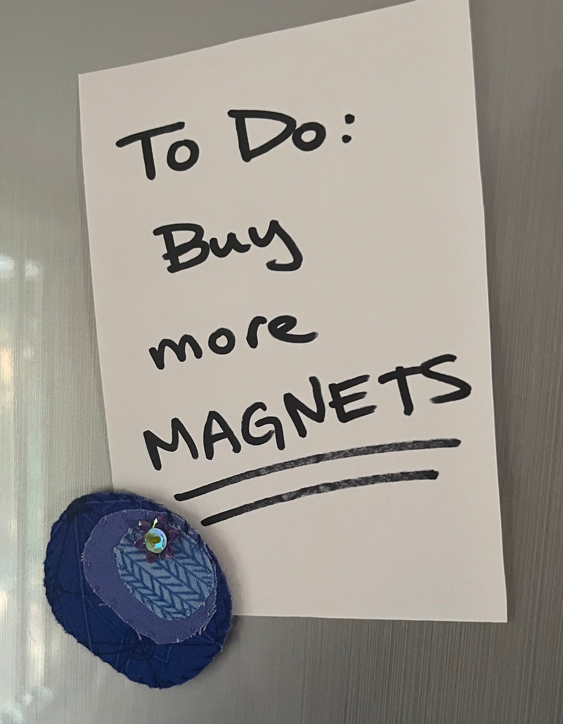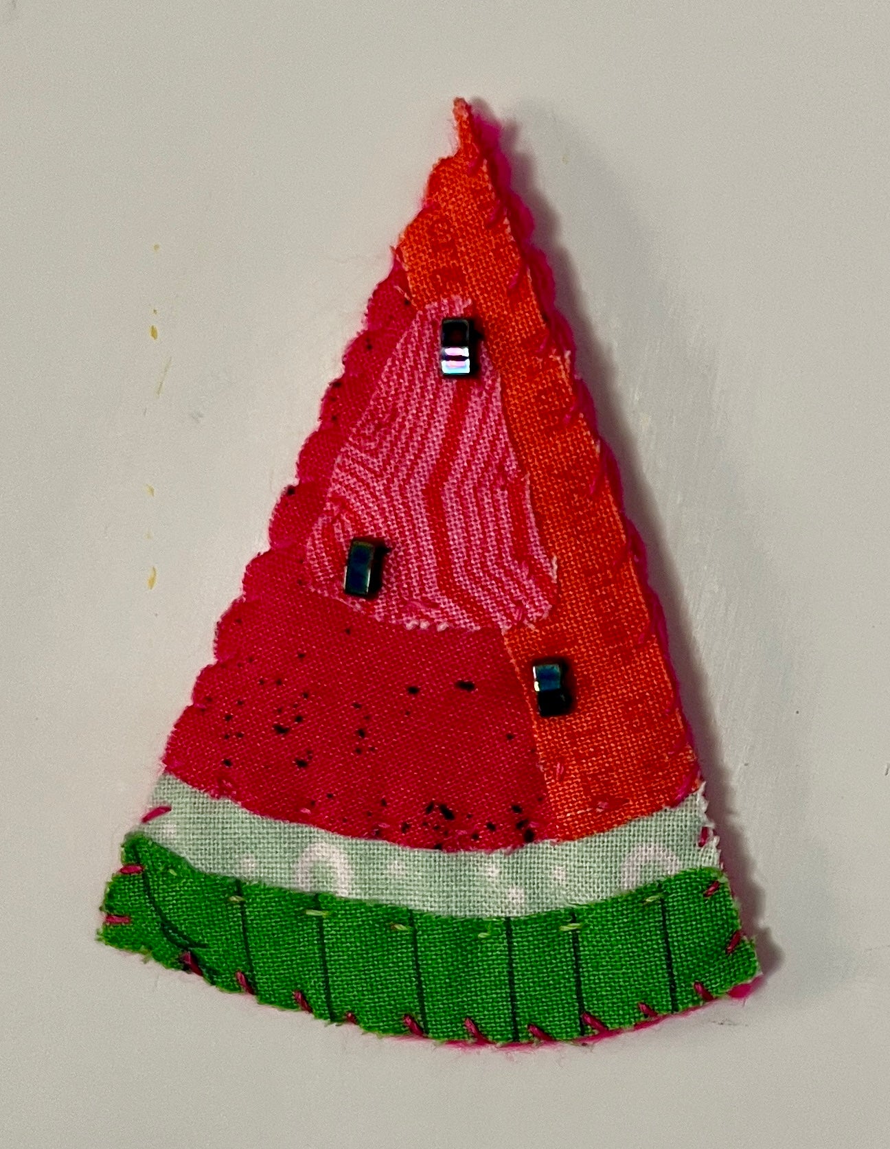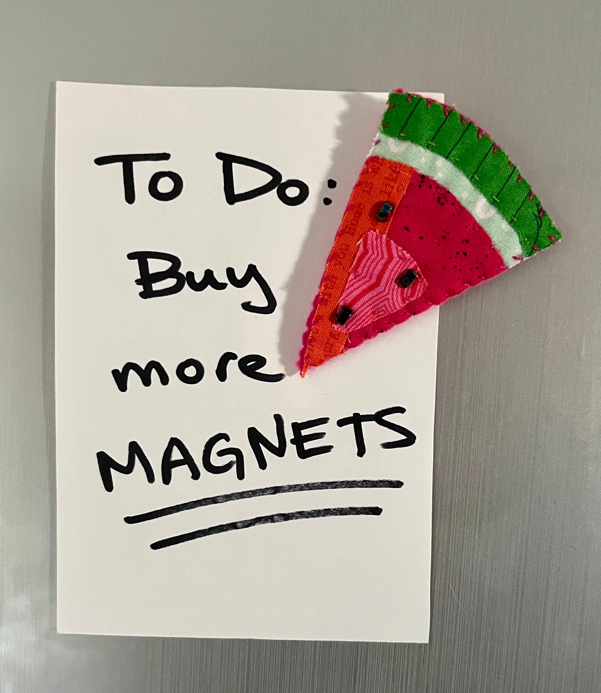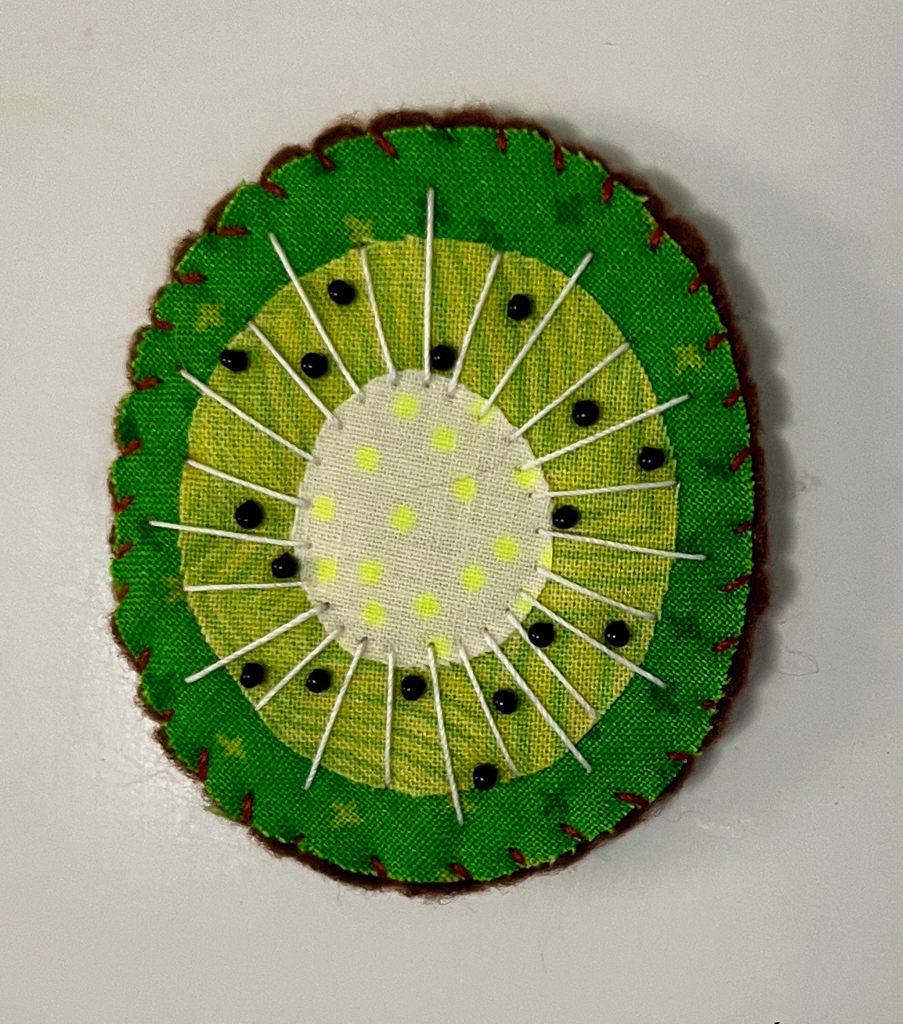 Hand-stitched and beaded refrigerator magnets that look like various fruits!