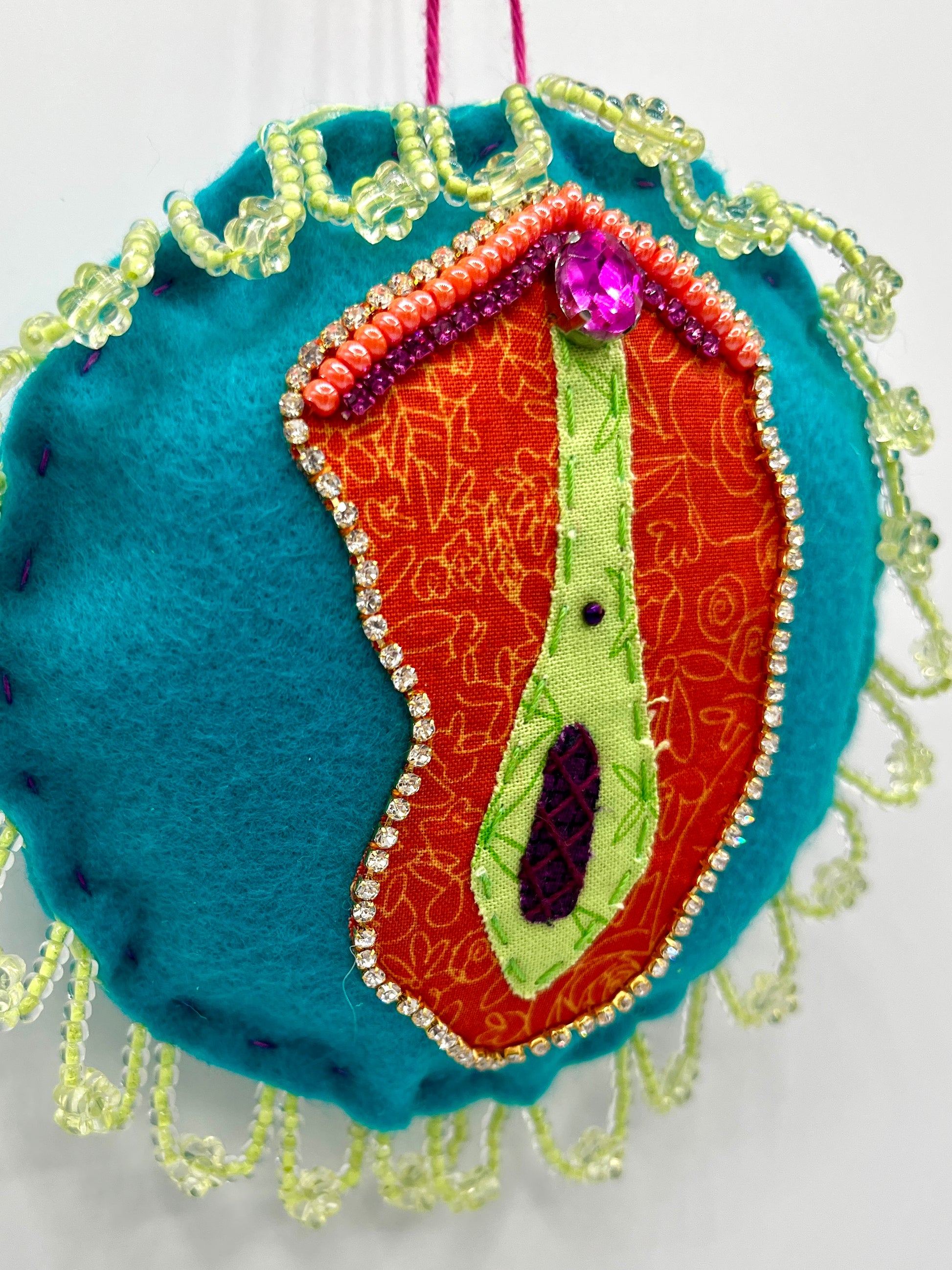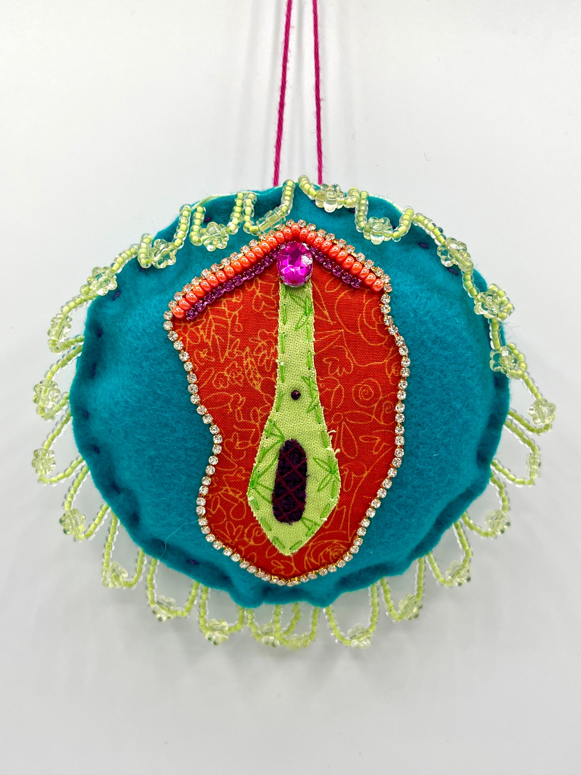 A wall-hanging glitzy vulva, adorned with rhinestones, beads, trim and embroidery.