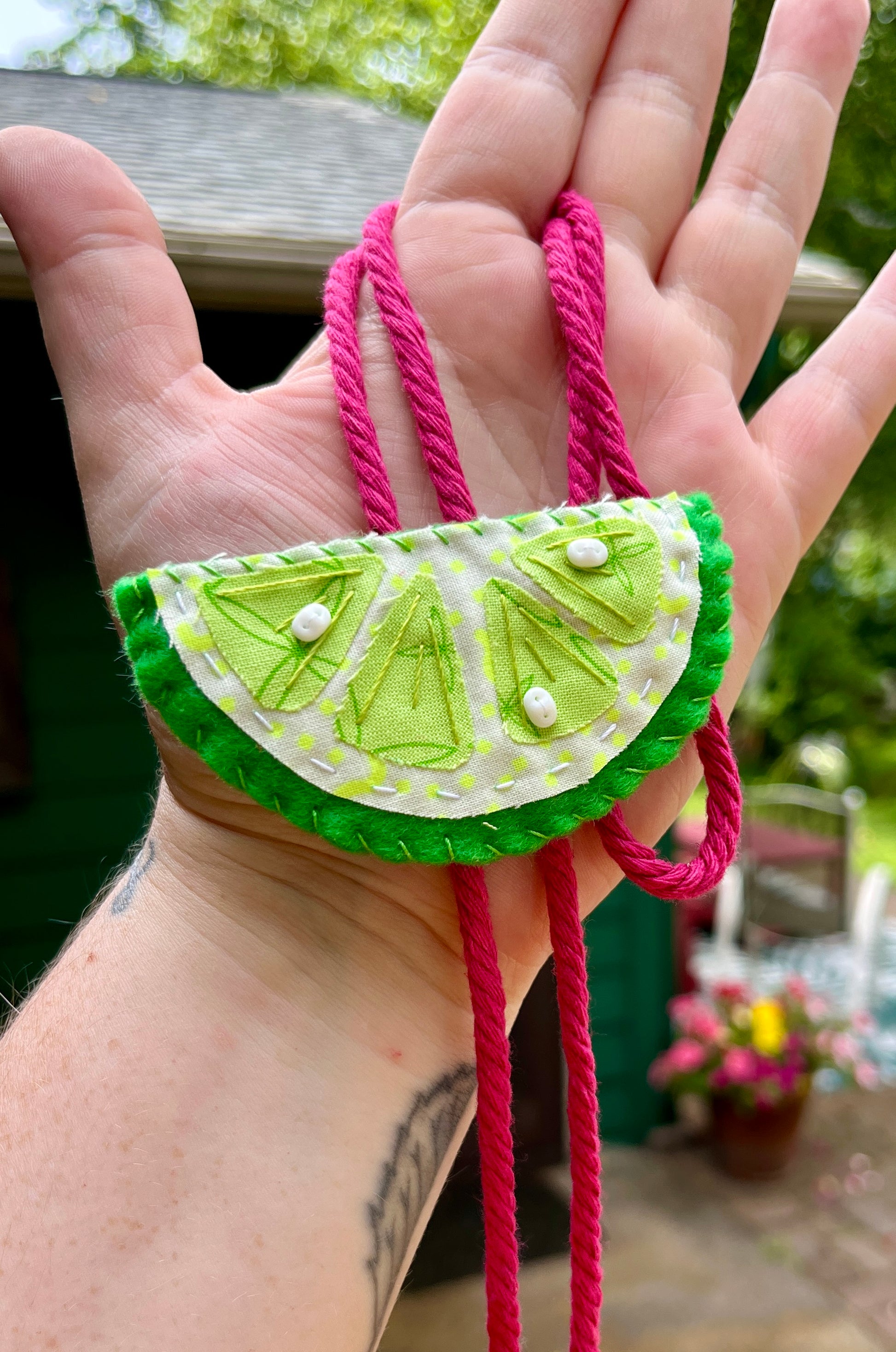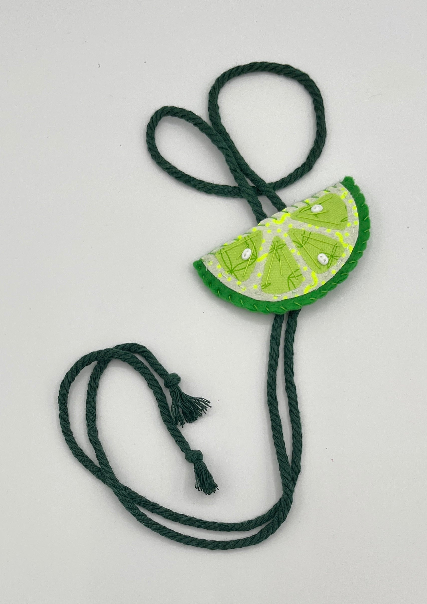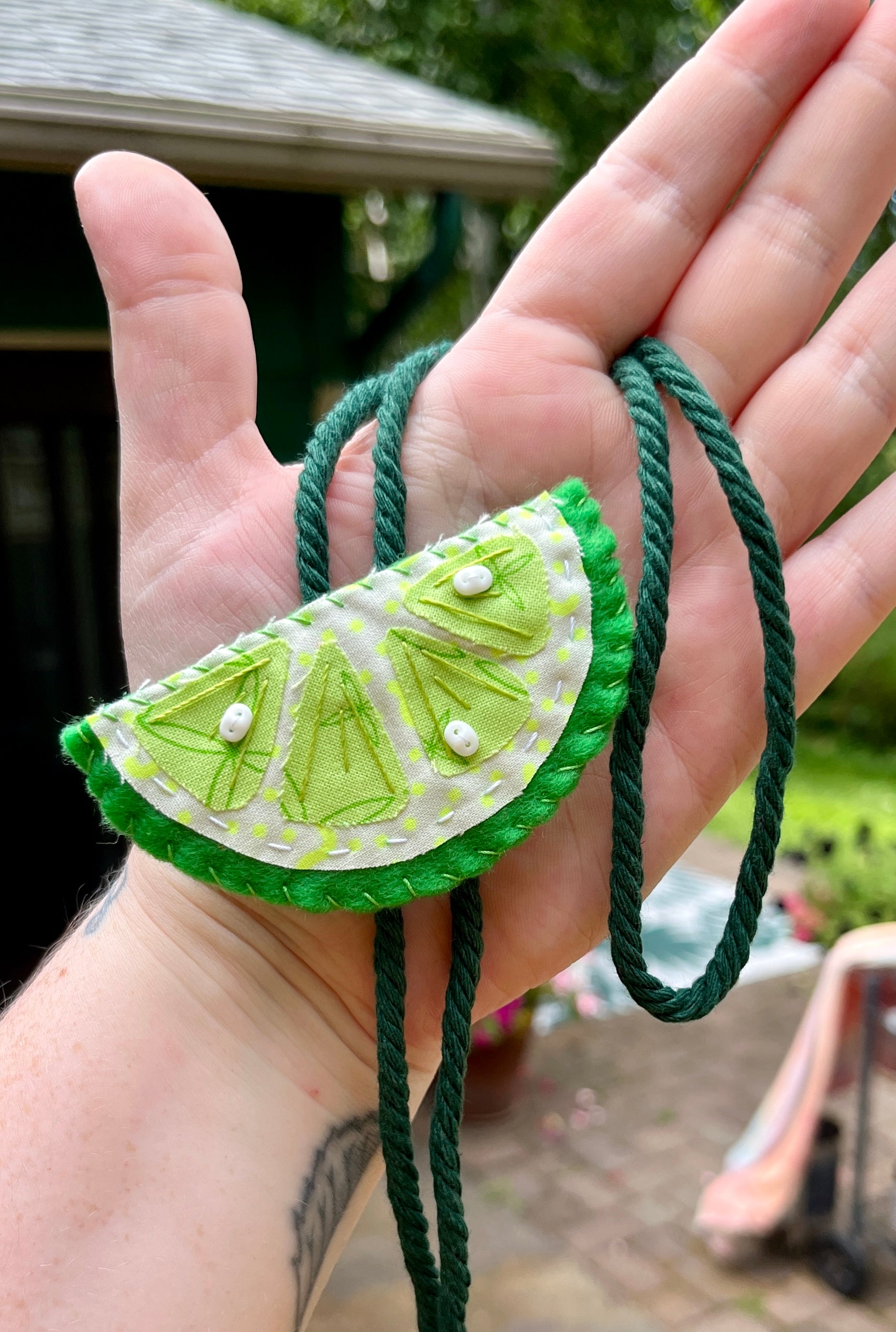 A hand-stitched fabric lime with bead seeds, on a cotton cord. You choose the cord color!