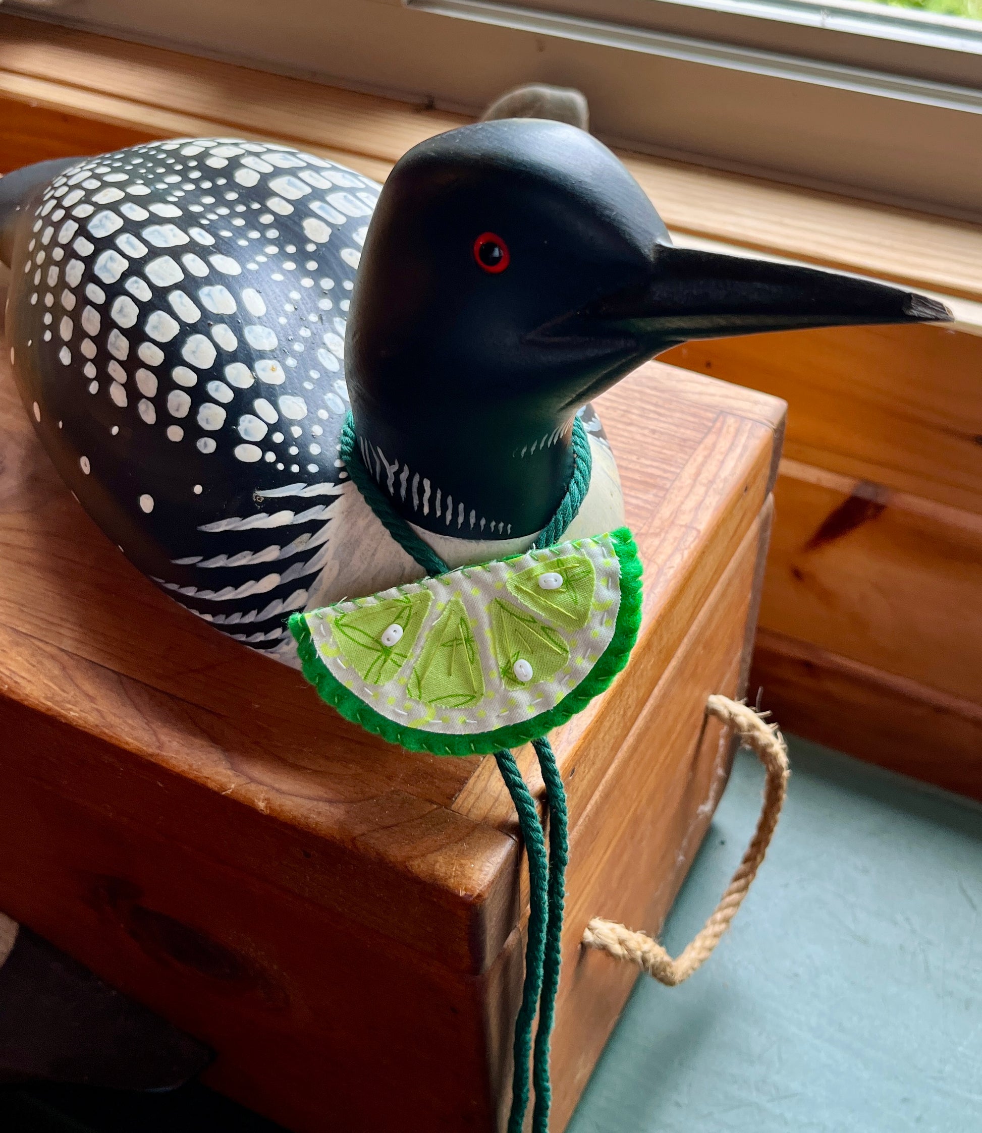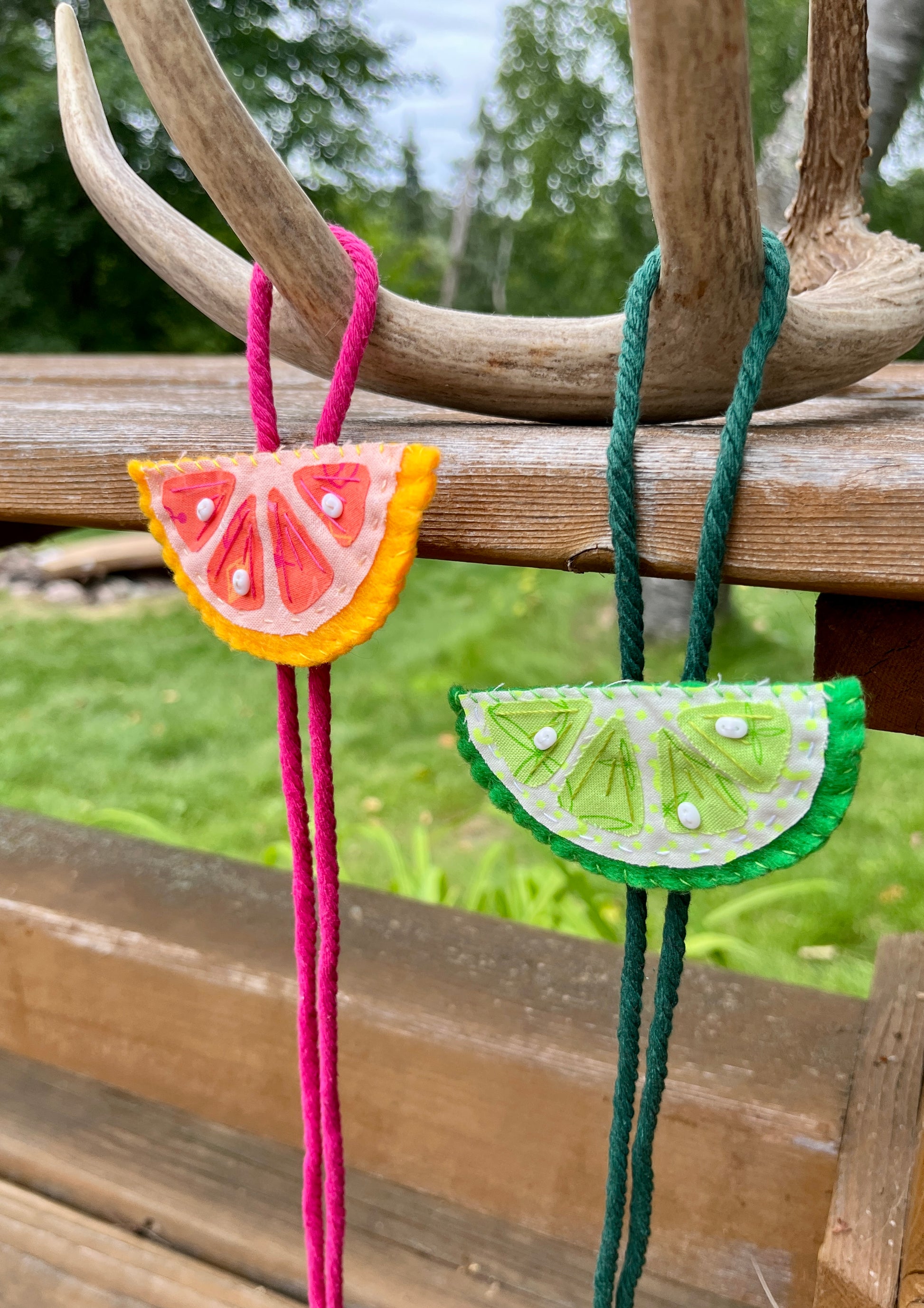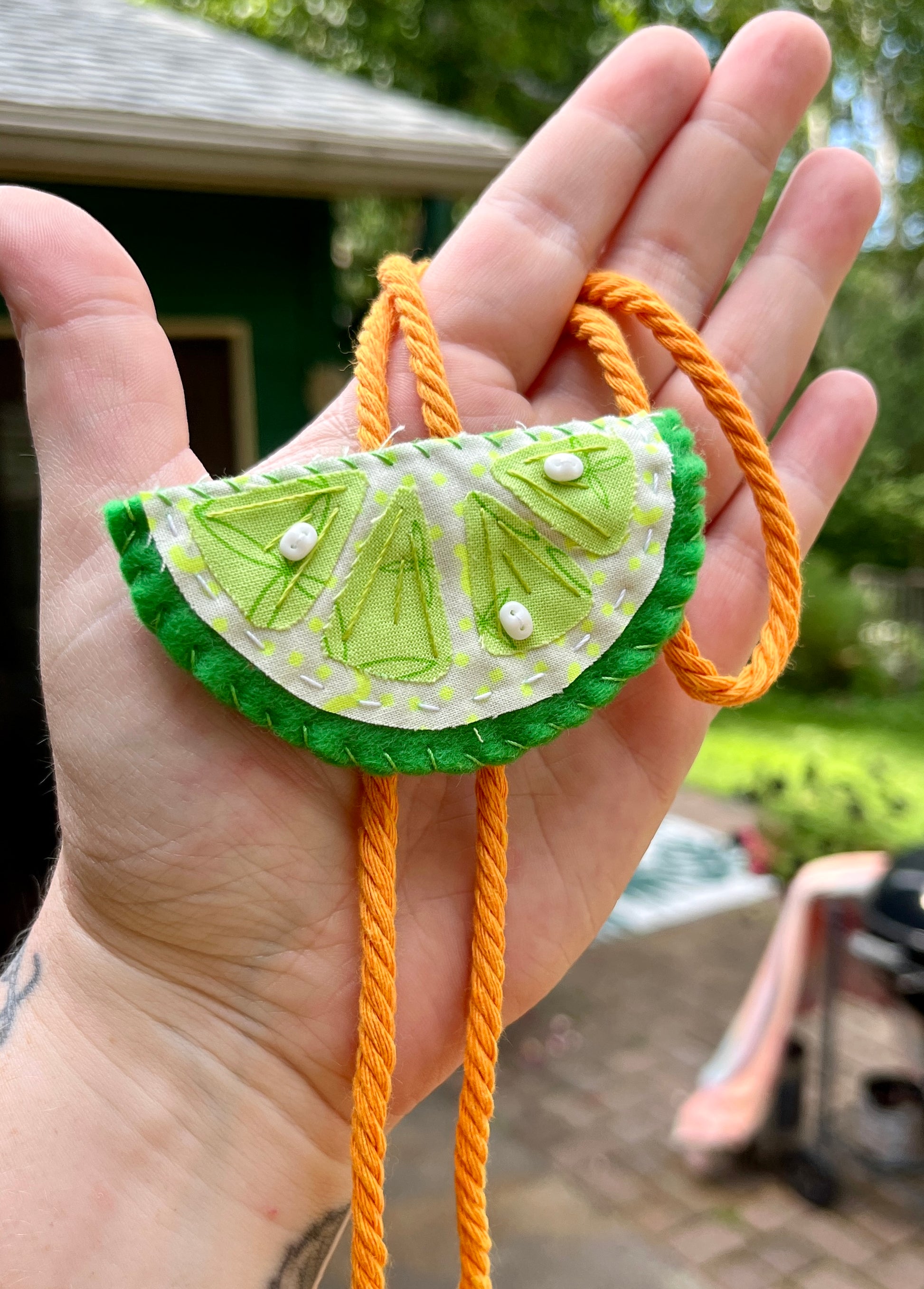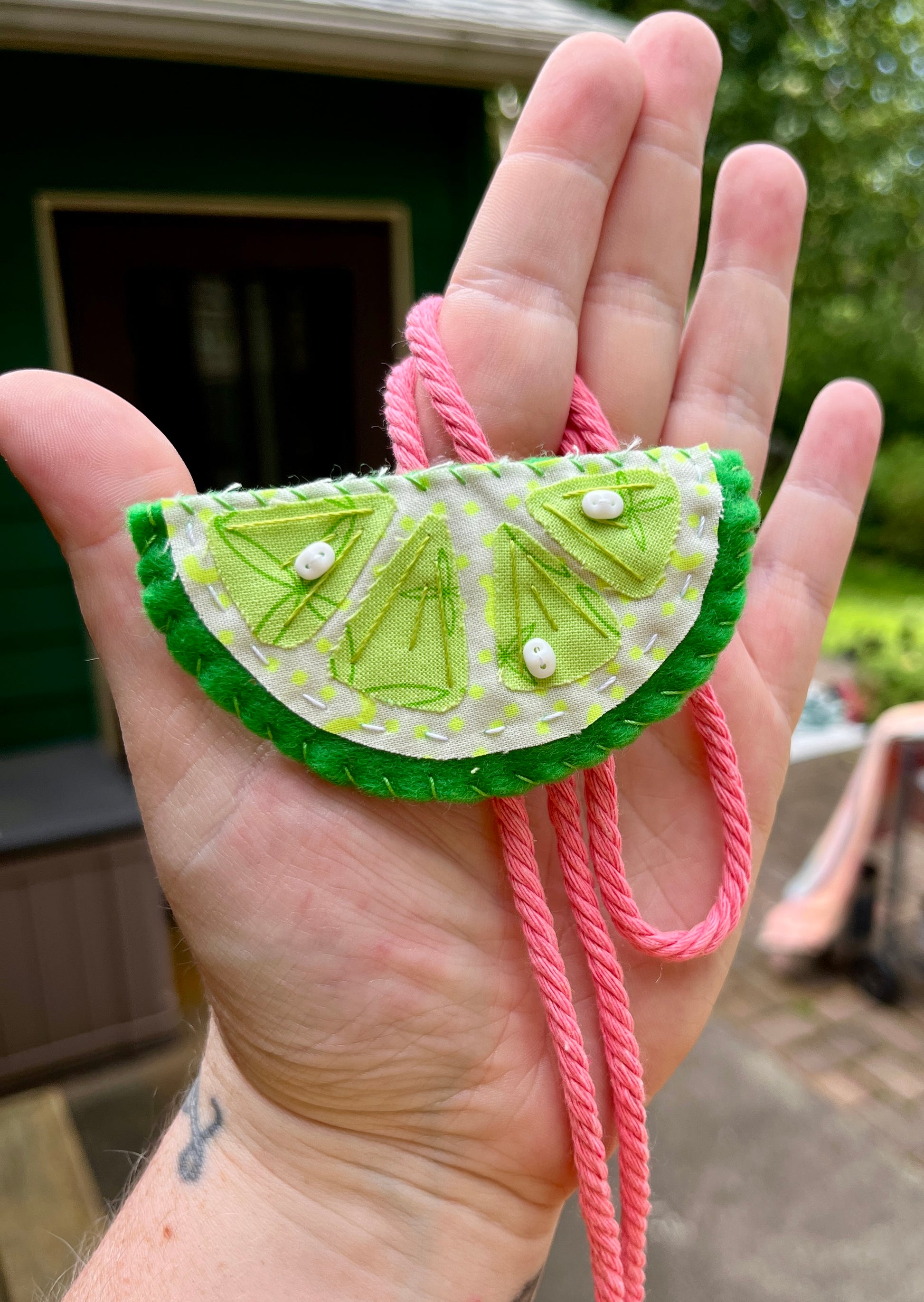 A hand-stitched fabric lime with bead seeds, on a cotton cord. You choose the cord color!