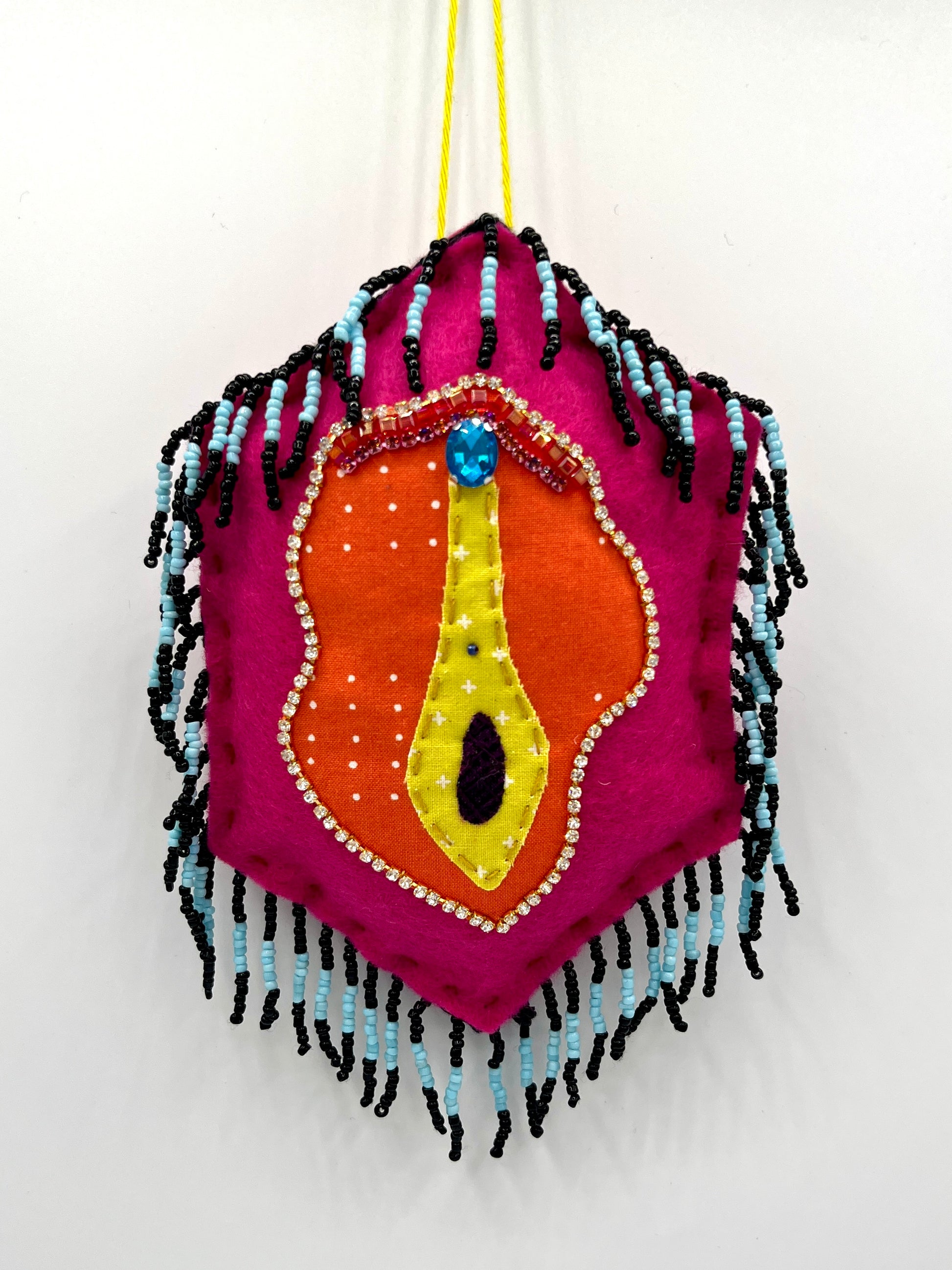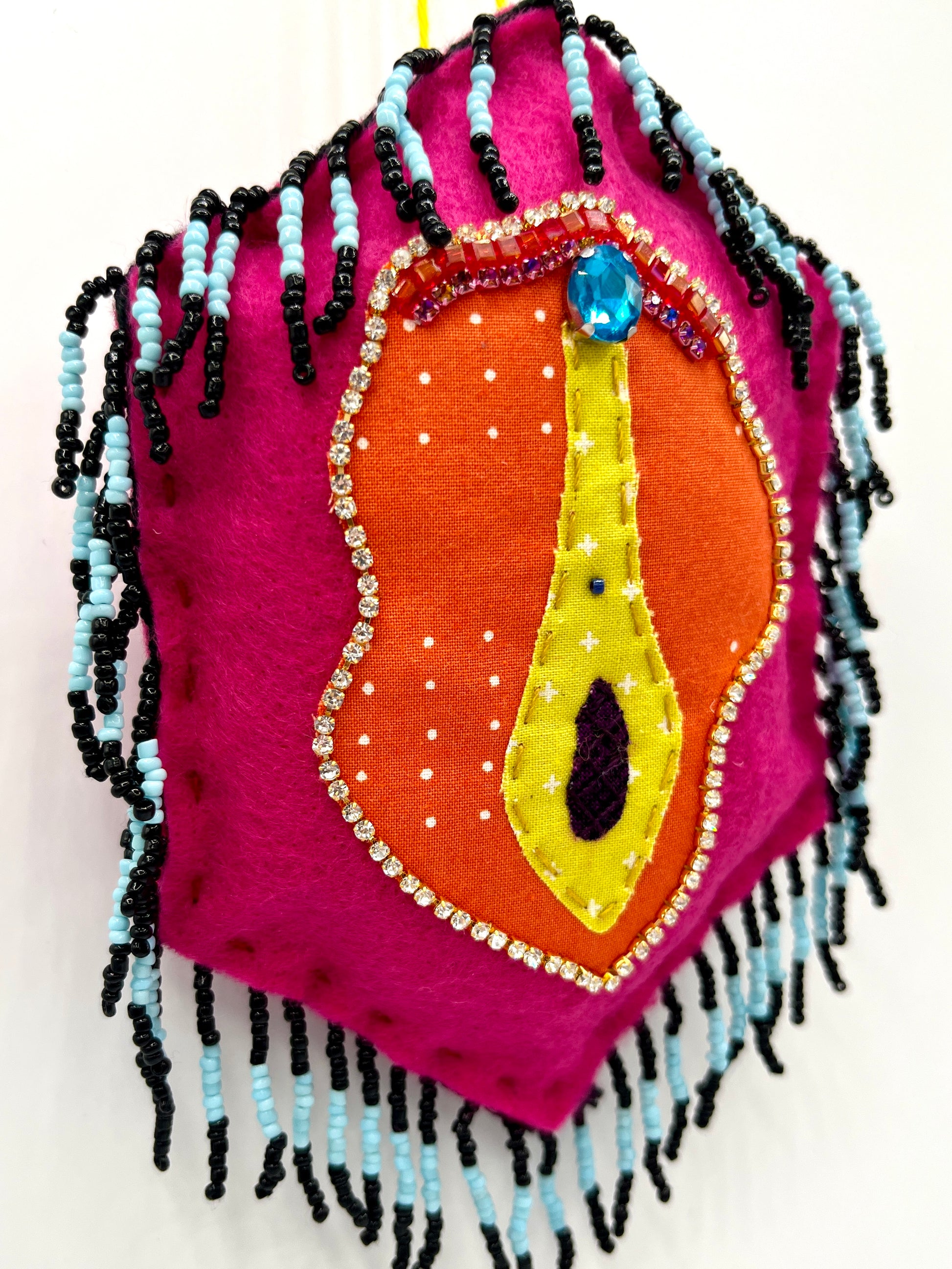 A wall-hanging glitzy vulva, adorned with rhinestones, beads, trim and embroidery.