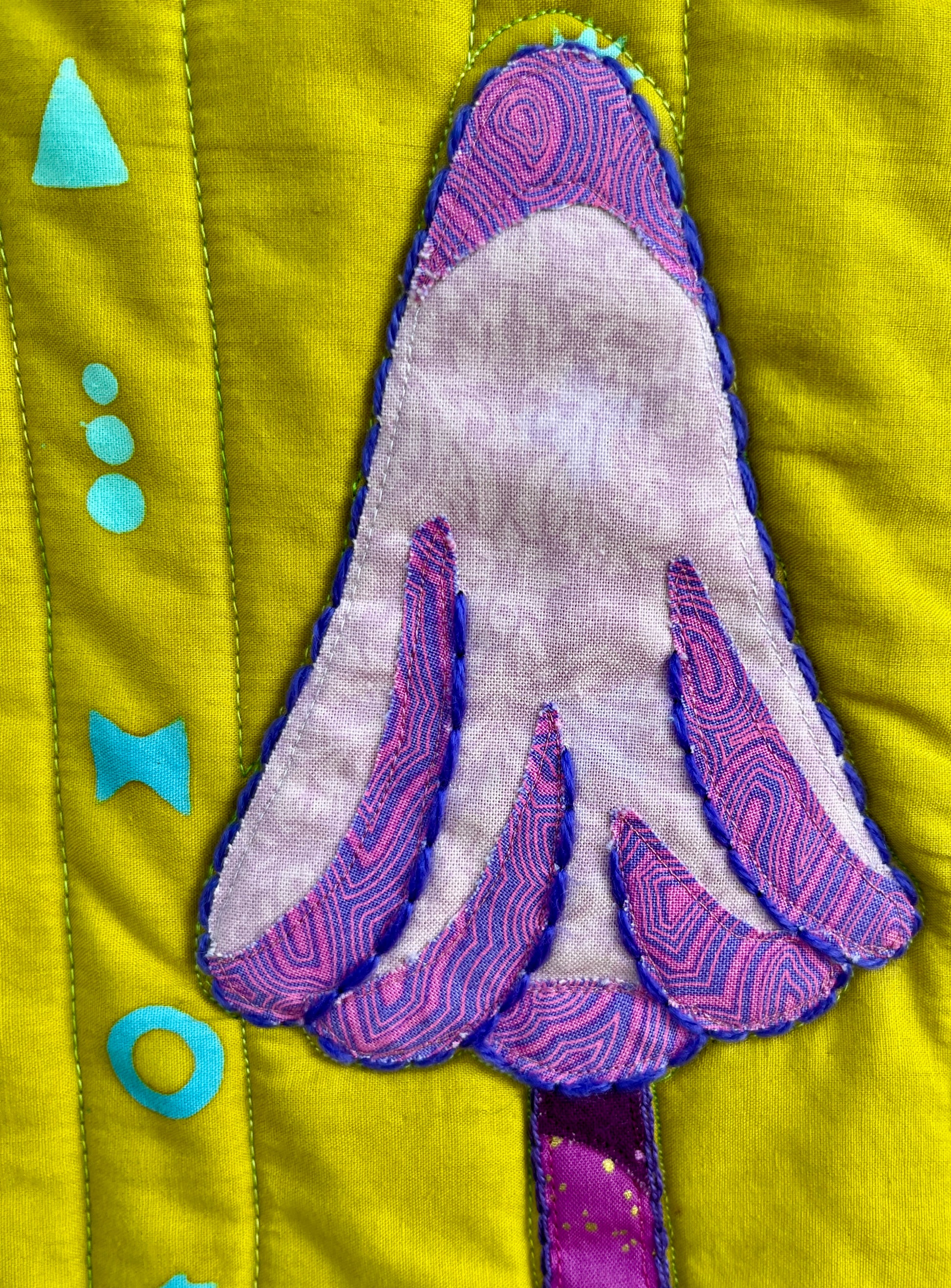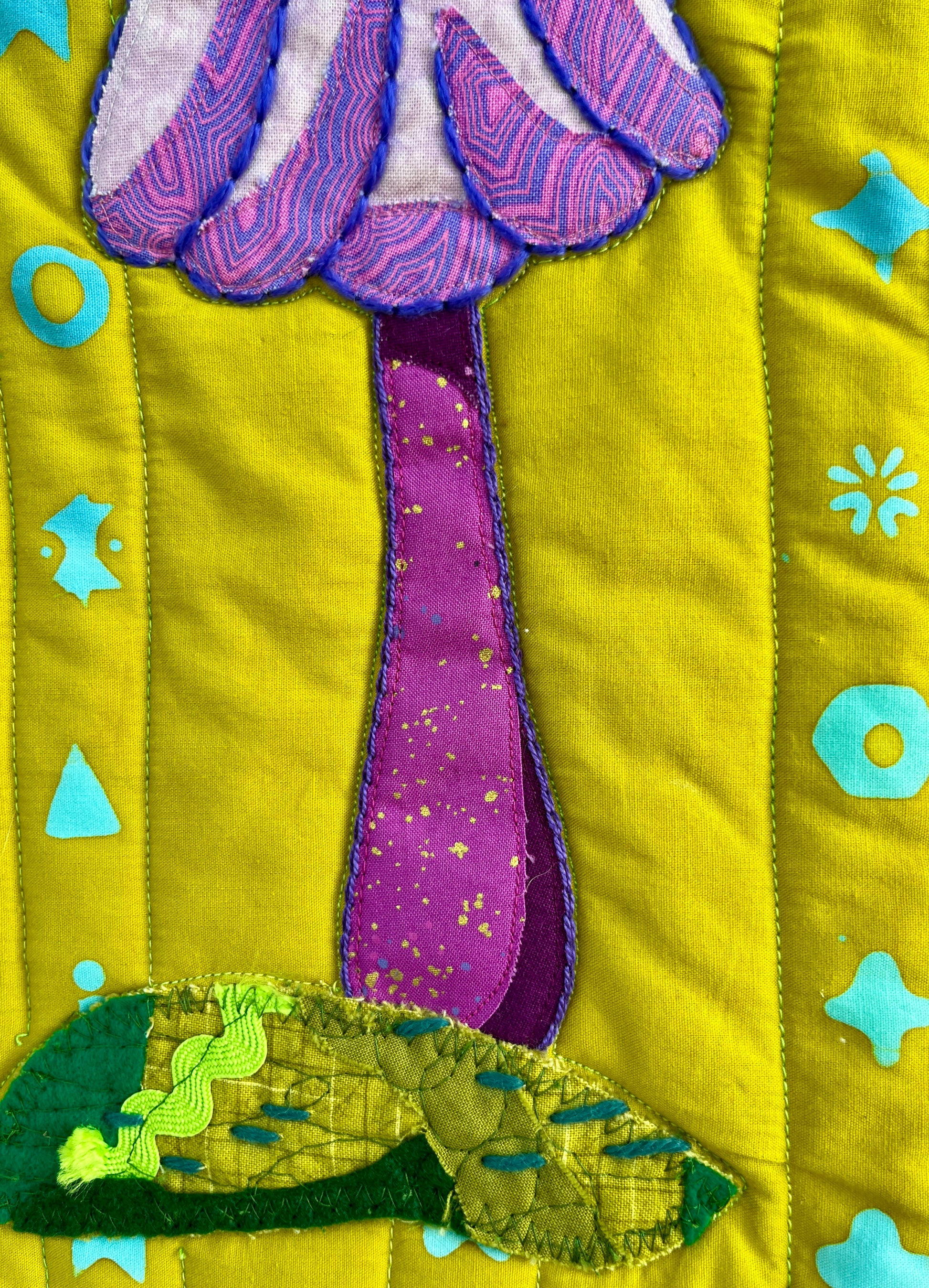 An original mini-quilt depicting a stylized purple capped mushroom (loosely based on the inky cap) on moss. Machine quilted and hand embroidered. Approx. 10”x18”.