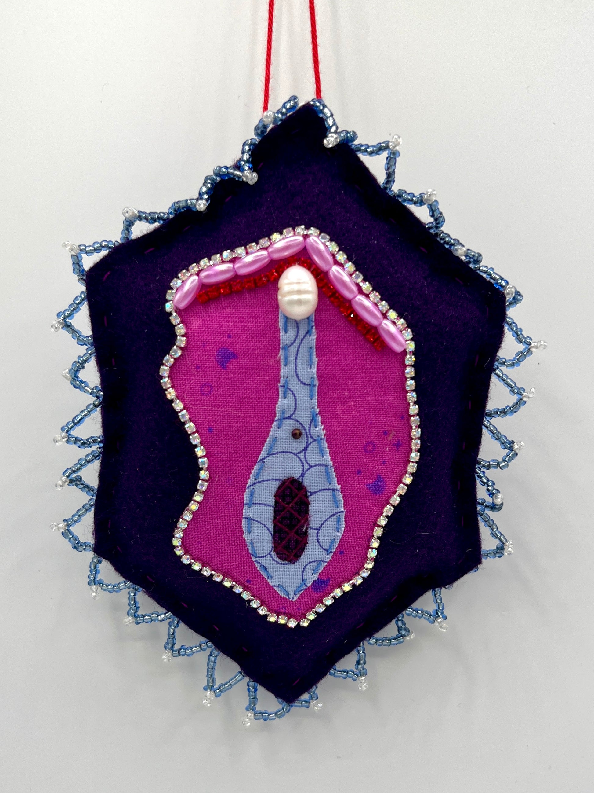 A wall-hanging glitzy vulva, adorned with rhinestones, beads, trim and embroidery.