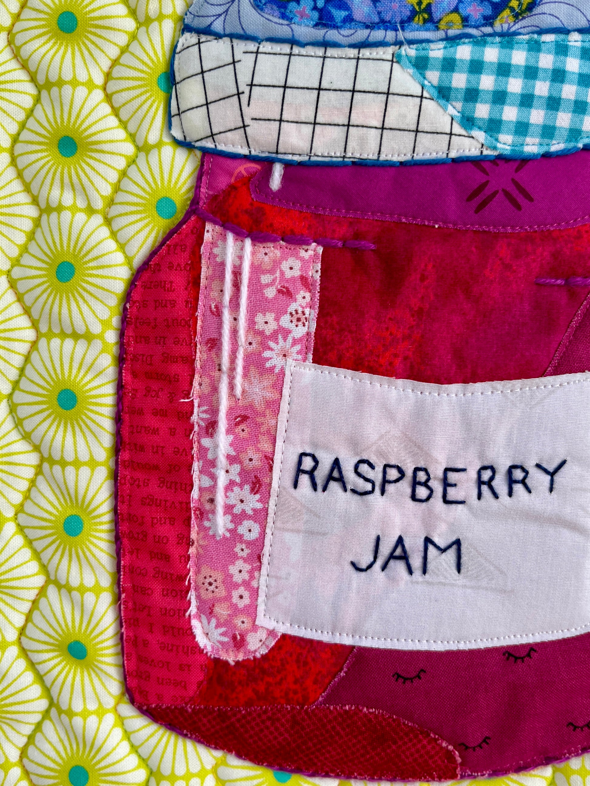 An original mini-quilt depicting a jar of raspberry jam. Machine quilted and hand embroidered. Approx. 14”x18”.