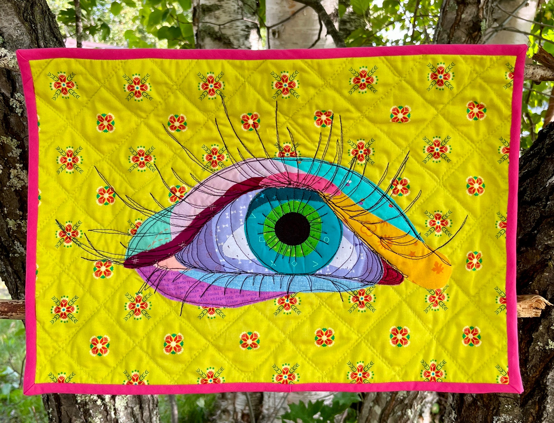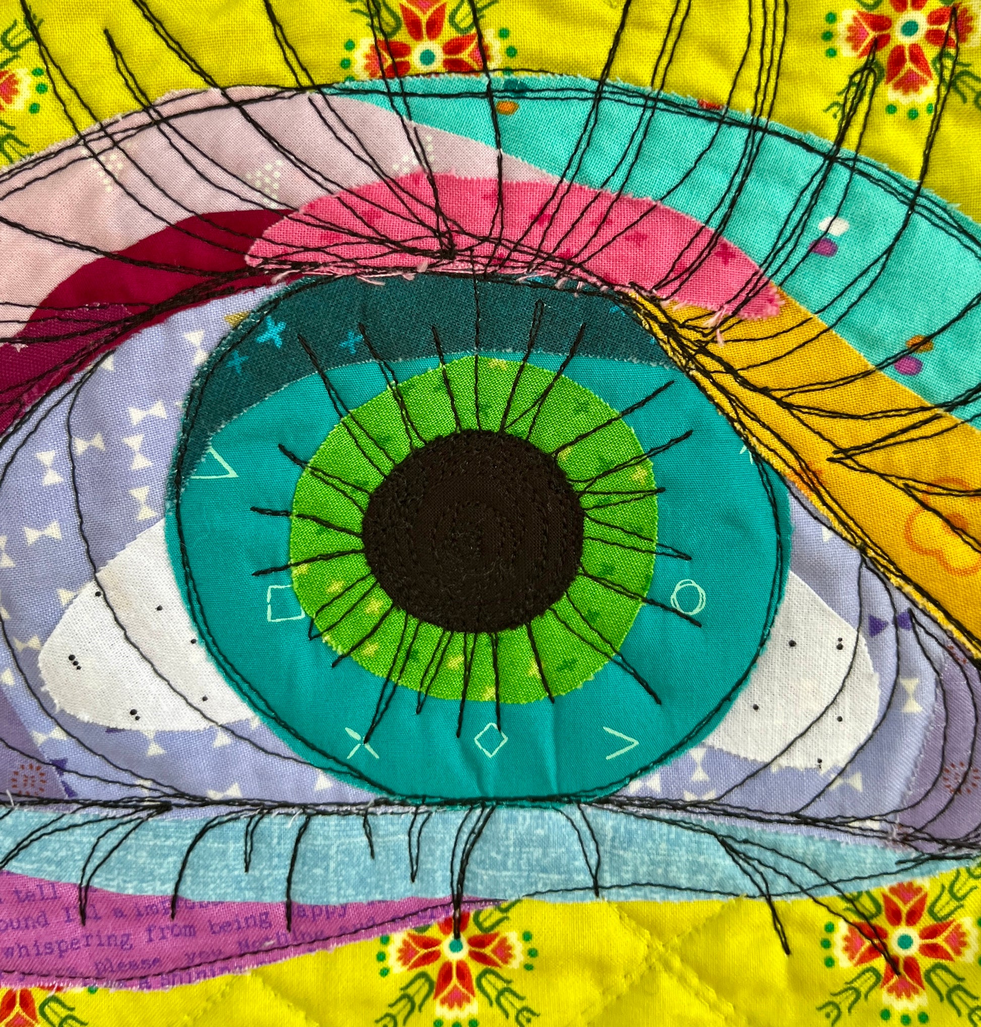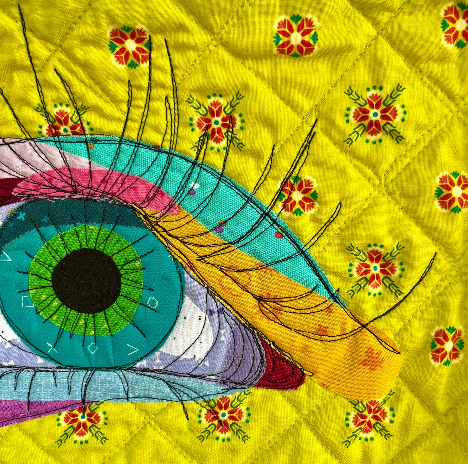 An original mini-quilt depicting an eye with long lashed, quilted with "scribble quilting". Machine quilted. Approx. 24”x16”.