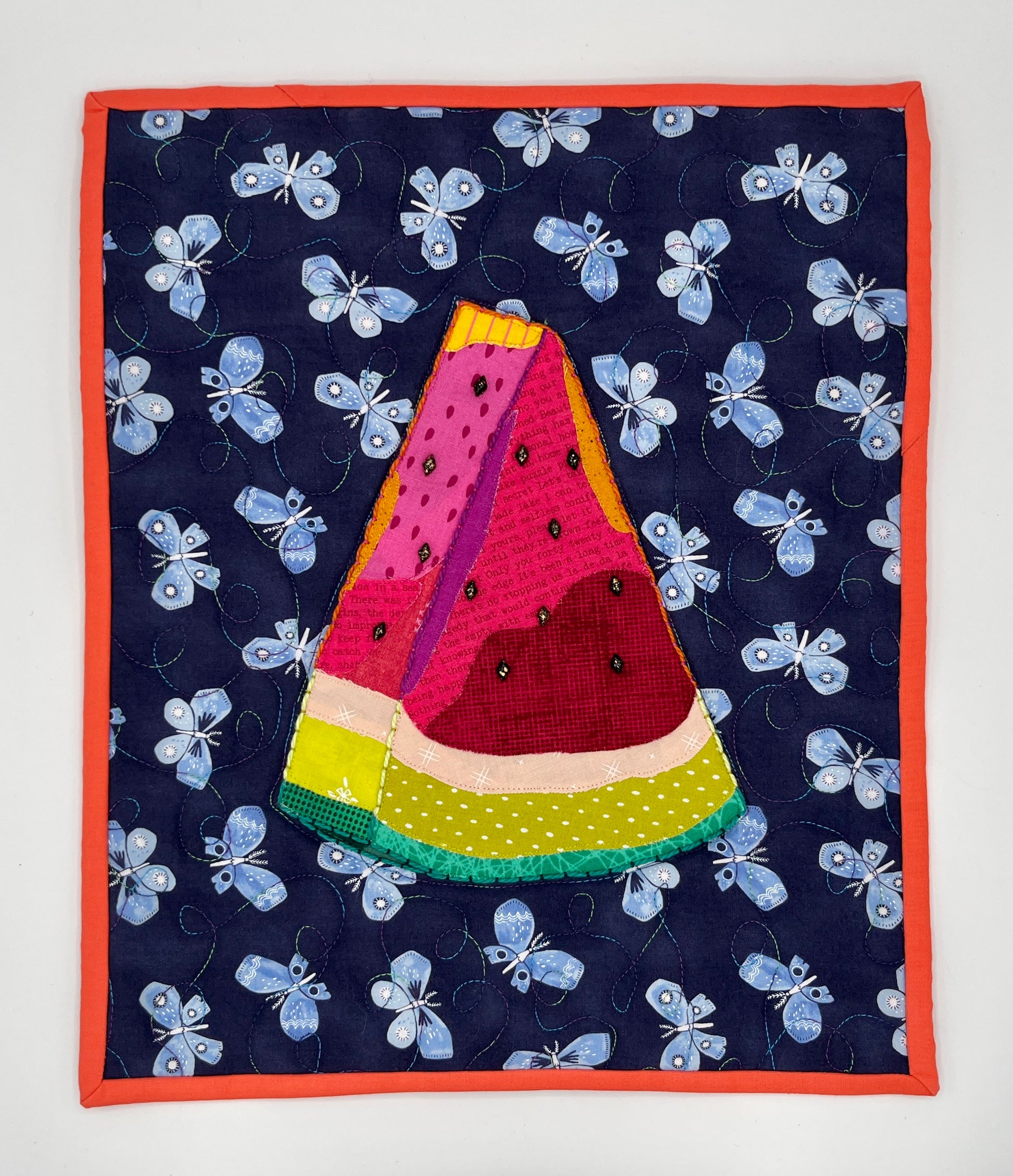Original wall quilt depicting a juicy watermelon slice, with glistening beaded seeds.